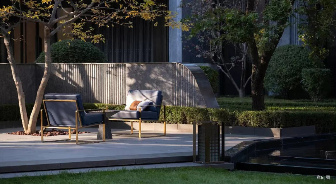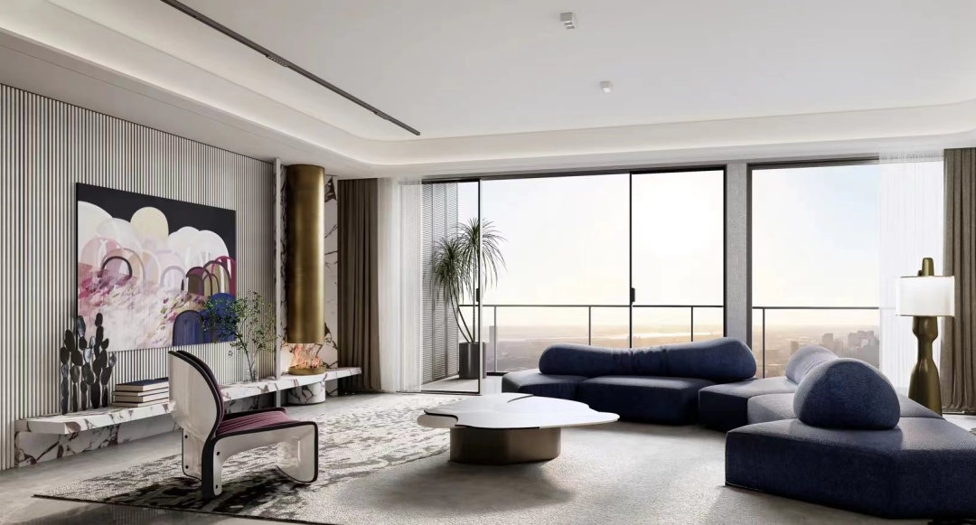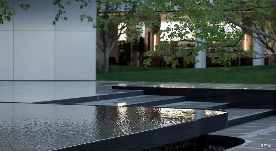 外立面采用大面积玻璃和香槟色金属弧形线条。