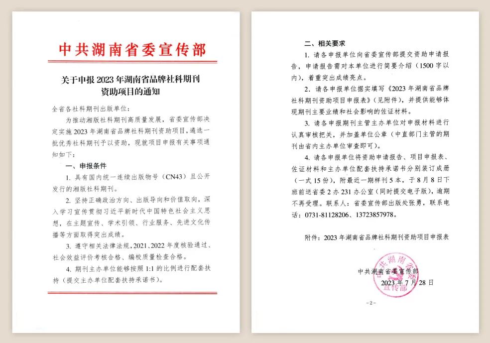 2023年湖南省品牌社科期刊资助项目由省委宣传部决定实施,旨在推动湘版社科期刊高质量发展,遴选一批始终坚持正确政治方向、出版导向和价值取向,深入学习贯彻习近平新时代中国特色社会主义思想特别是习近平文化思想,在主题宣传、学术引领、行业服务、先进文化传播等方面取得突出成绩的优秀社科期刊予以资助。