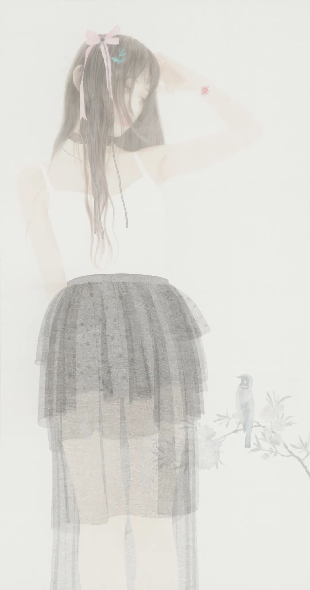 Xu Hualing's works are inspired by the youthful images of contemporary women and her daily surroundings. All the time, intricate line and pale colors have always been the distinctive features of Xu's works. She consciously avoids delineating the outlines in traditional Gongbi painting. Instead, she uses light and shade and purposefully weakens the contrast. The pale colors render the blurring of a faint and misty figure. Xu also places the realism of traditional brushwork and the reality of photographic printing on the same surface enriches the hierarchy of the picture, showing the world like a daydream in her eyes.