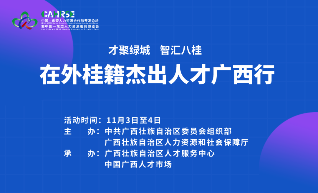为深入贯彻落实新时代人才强桂战略,凝聚在外桂籍人才智慧力量和资源优势,促进人才回桂、项目回移、资本回流、技术回归、智力回哺,群策群力建设新时代壮美广西,在中国—东盟人力资源合作与开发论坛暨中国—东盟人力资源服务博览会期间举办在外桂籍杰出人才广西行活动,同时推出在外桂籍杰出人才事迹栏目,讲好人才故事,传递人才力量。