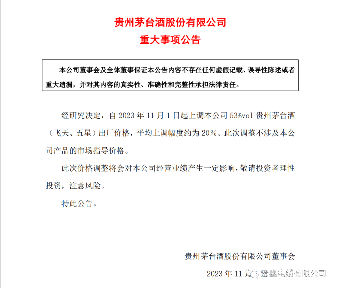 贵州茅台酒股份有限公司董事会发布公告,经研究决定,自2023年11月1日起上调本公司53%vol贵州茅台酒(飞天、五星)出厂价格,平均上调幅度约为20%。此次调整不涉及本公司产品的市场指导价格。茅台表示,此次价格调整将会对公司经营业绩产生一定影响,敬请投资者理性投资,注意风险。