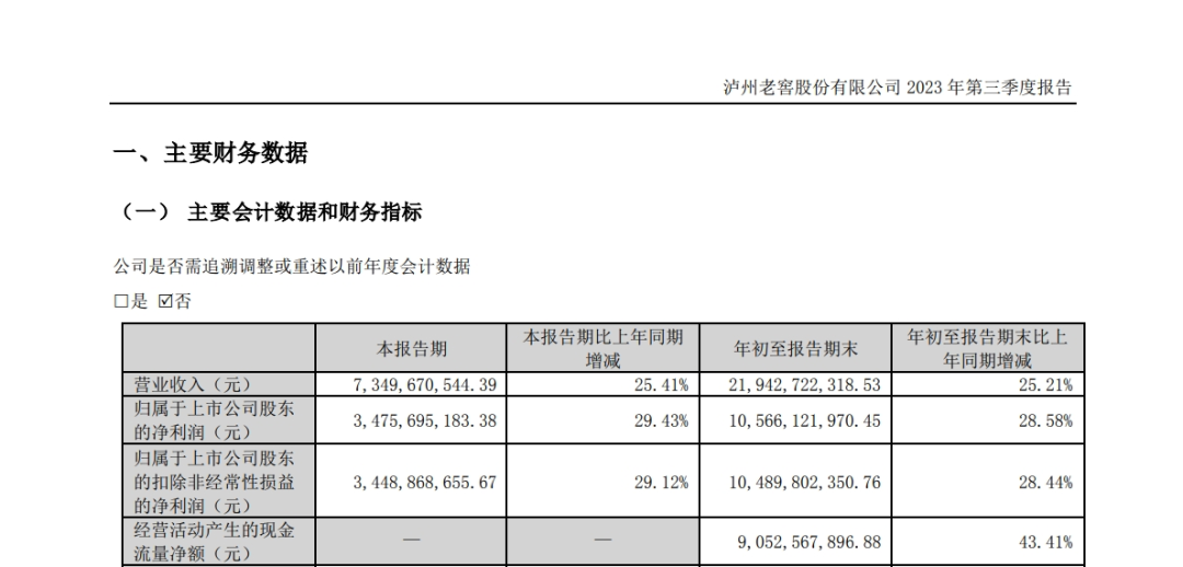 以泸州老窖为例,今年第三季度,泸州老窖实现营业收入73.49亿元,同比增长25.41%;实现净利润34.76亿元,同比增长29.43%左右。相比于2023年上半年,泸州老窖第三季度的收入、利润增长还在加速中,显著超出各方预期。