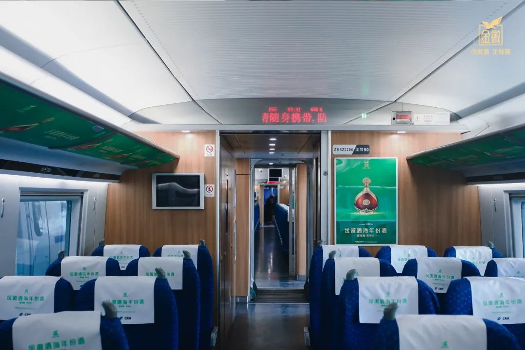 我们可以看到,金徽酒此次冠名的高铁专列,和金徽酒的品牌形象实现了完美的融和。从外部醒目显眼的“金徽酒 正能量”品牌标识,到高铁内部空间的走廊、车门、座椅、行李架、桌贴、滚动屏等位置,包括到站语音播报,均实现了代表产品——金徽酒海年份酒形象的全方位、立体化的覆盖,在沉浸式传播下,这无疑为金徽酒品牌的营销造势提供了强大的支撑力。