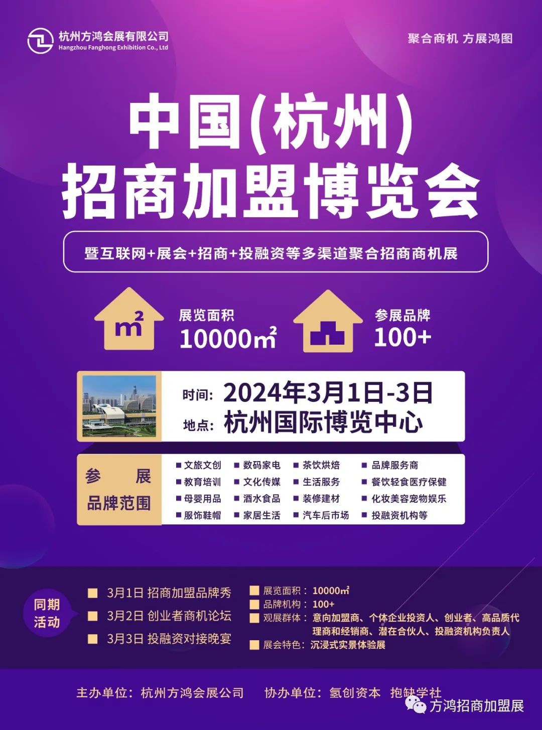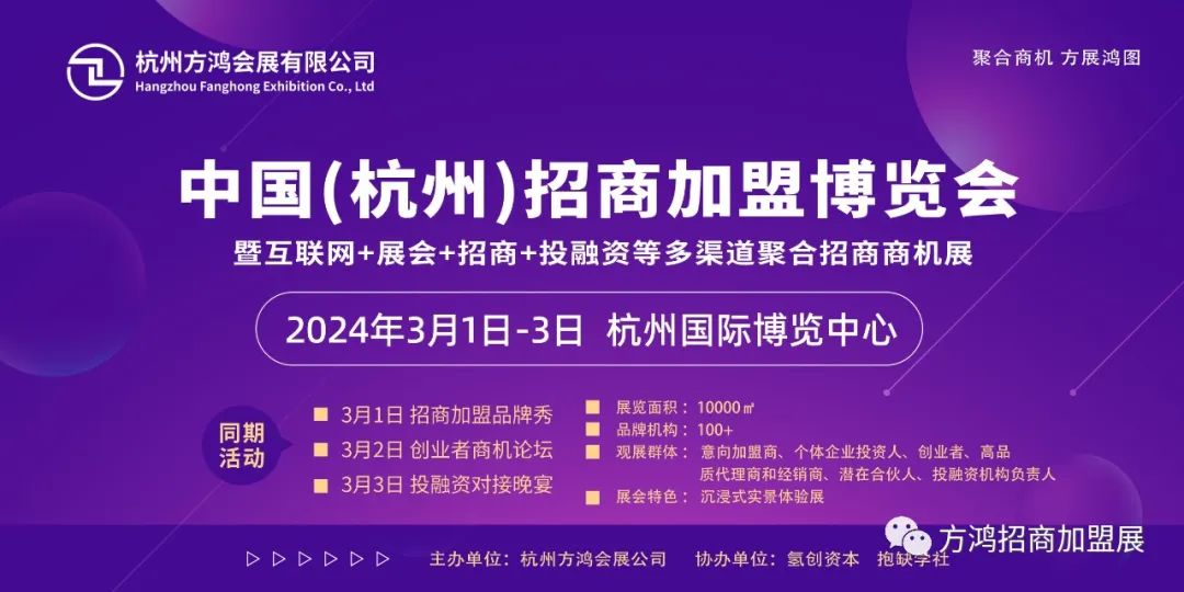 中国(杭州)国际招商加盟博览会(以下简称“杭州加盟展”)是2024年3月1日至3日在杭州国际博览中心举行的一场盛大的连锁加盟行业展览活动。该展会聚焦于连锁加盟行业的创新与发展,为各行业提供了一个独特的商机,为品牌提供高性价比的招商加盟渠道,助力行业的繁荣和发展。