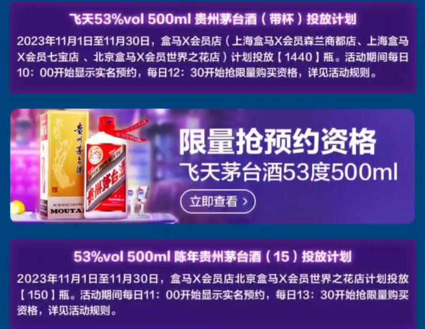 预约报名时间为11月2日、5日、7日、9日0: 00-24: 00,系统将对报名用户进行随机摇号,摇号中签的会员名单将于次日10: 00在“零售中签公告”专栏进行公示,中签会员选购商品时间段为名单公示当天(11月3日、6日、8日、10日)12:00-18:00。