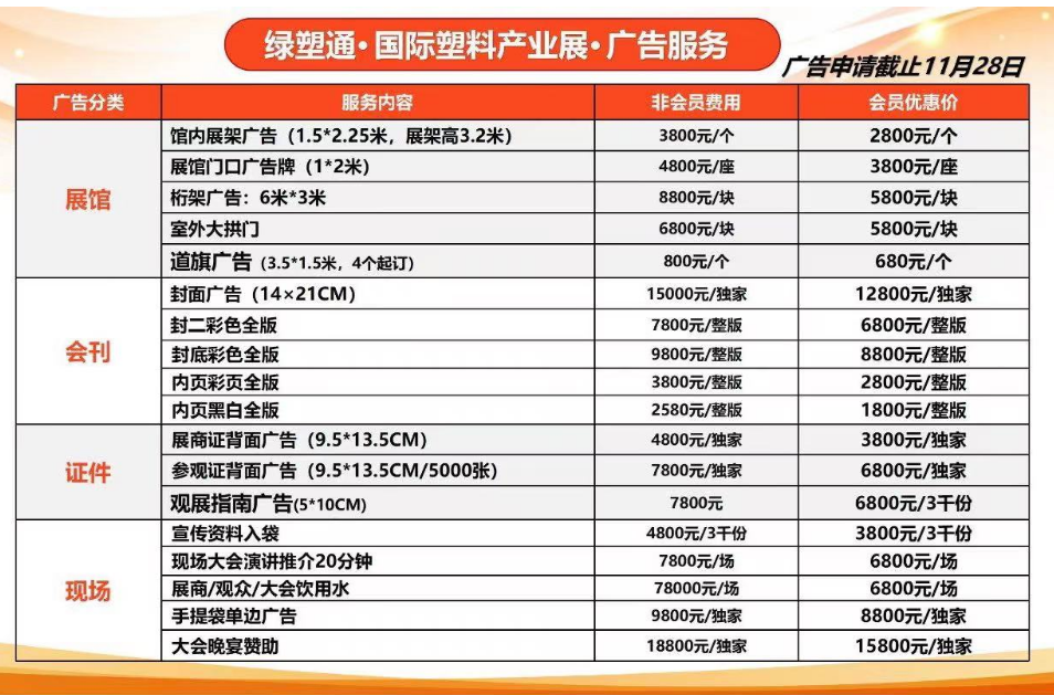 1 、展位服务:按尺寸搭建好展台、场地、楣牌、洽谈桌一张两椅、射灯二支、插座、保安清洁等; 2、感恩特惠价针对在11月28日前办理付款手续且分享本企业参展链接的会员; 3、在11月28日以后办理付款,不保证专业公众号推荐及录入会议相关资料; 4、冠名赞助、特装要求请咨询服务经理 :15262777771 王菲菲 | |