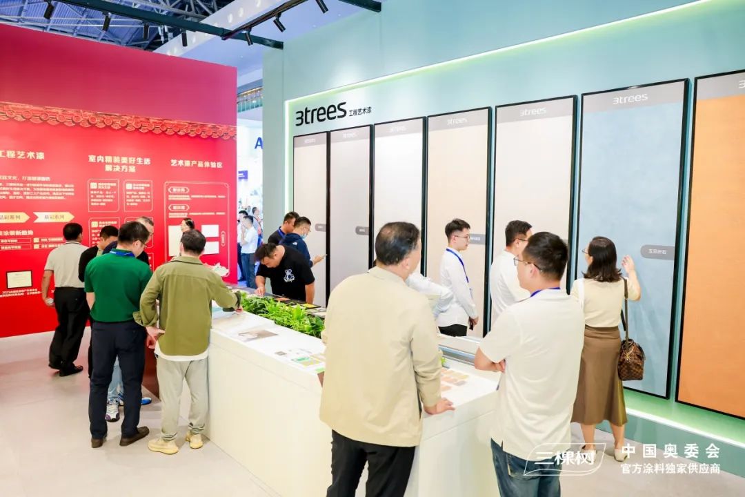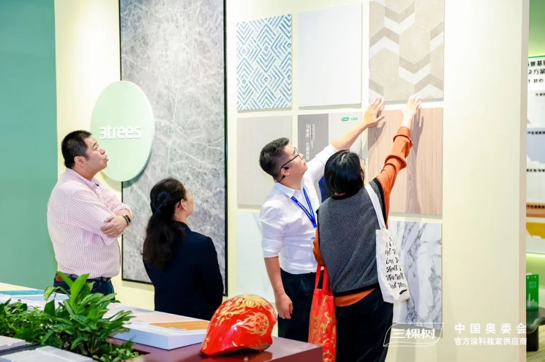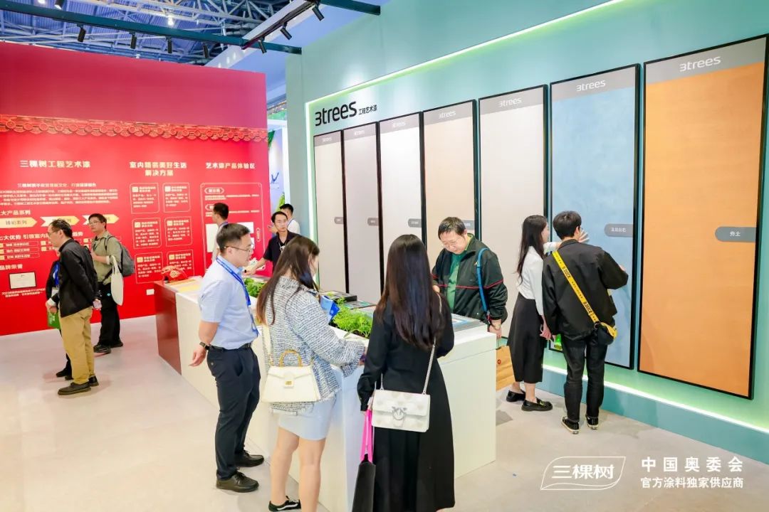 现场,三棵树室内装饰新材料吸引了众多行业内外人士的关注与讨论。展馆通过打造沉浸式体验和场景化互动充分展现工程艺术漆、小森板等室内精装产品。今年8月,三棵树与故宫宫廷文化达成战略合作,将故宫宫廷文化元素融入室内精装色彩美学与产品应用,生动展现了国漆国色的文化魅力。凭借别具匠心的展馆设计和优秀的品牌知名度,三棵树展馆吸引众多室内装饰领域参展者,并通过现场互动了解工程艺术漆易擦洗、抗菌防霉、强效净味等优势。参展者纷纷表示三棵树工程艺术漆可以完美取代墙纸、墙布等传统材料,后续会持续关注三棵树工程在室内装饰材料上的研发与推广。