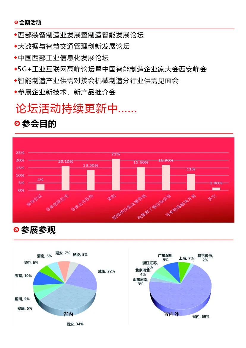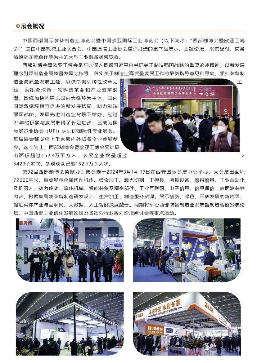 西部制博会既欧亚工博会是在以深入贯彻习近平总书记关于制造强国战略的重要论述精神,以新发展理念引领制造业高质量发展为指导,落实关于制造业高质量发展工作的最新指导意见和导向,紧扣装备制造业高质量发展主题,以供给侧结构性改革为线,紧跟全球新一轮科技革命和产业变革浪朝,围绕加快构建以国内大循环为主体、国内国际双循环相互促进的新发展格局,助力制造虽国战略、发展先进制造业背景下举办。经过1年的积累与发展取得了长足进步,已成为国示展览业协会(UFI)认证的国际性专业展会。每届展会都吸引上千家海内外知名企业参展参会。迄今为止,西部制博会暨欧亚工博会累计展出面积超过152.4万平方米,参展企业数量超过423余家次,参观观众已超152.7万余人次,中国心部同际装看制连世得见食中国歌亚国际工业携览会 主会场第32届西部制博会暨欧亚工博会定于2024年3月14-17日在西安国际会展中心举办,大会展出面积72000平米,重点展示金属切削机床、饭金加工、激光切割、工模具、测量设备、磨料磨具、工业自动化及机器人、动力传动、流体机械、智能装备及精密部件、工业互联网、电子信息、信息通信、表面涂装等内容,将聚集高端装备制造研发设计、生产加工、制造服务资源,展示创新、绿色、开放发展的新成果足进实体产业与互联网、大数据、人工智能深度融合。同期将举办西部装备制造业发展暨制造智能发展论云、中国西部工业信化发展论坛及各细分行业系列论坛研讨会等重点活动。