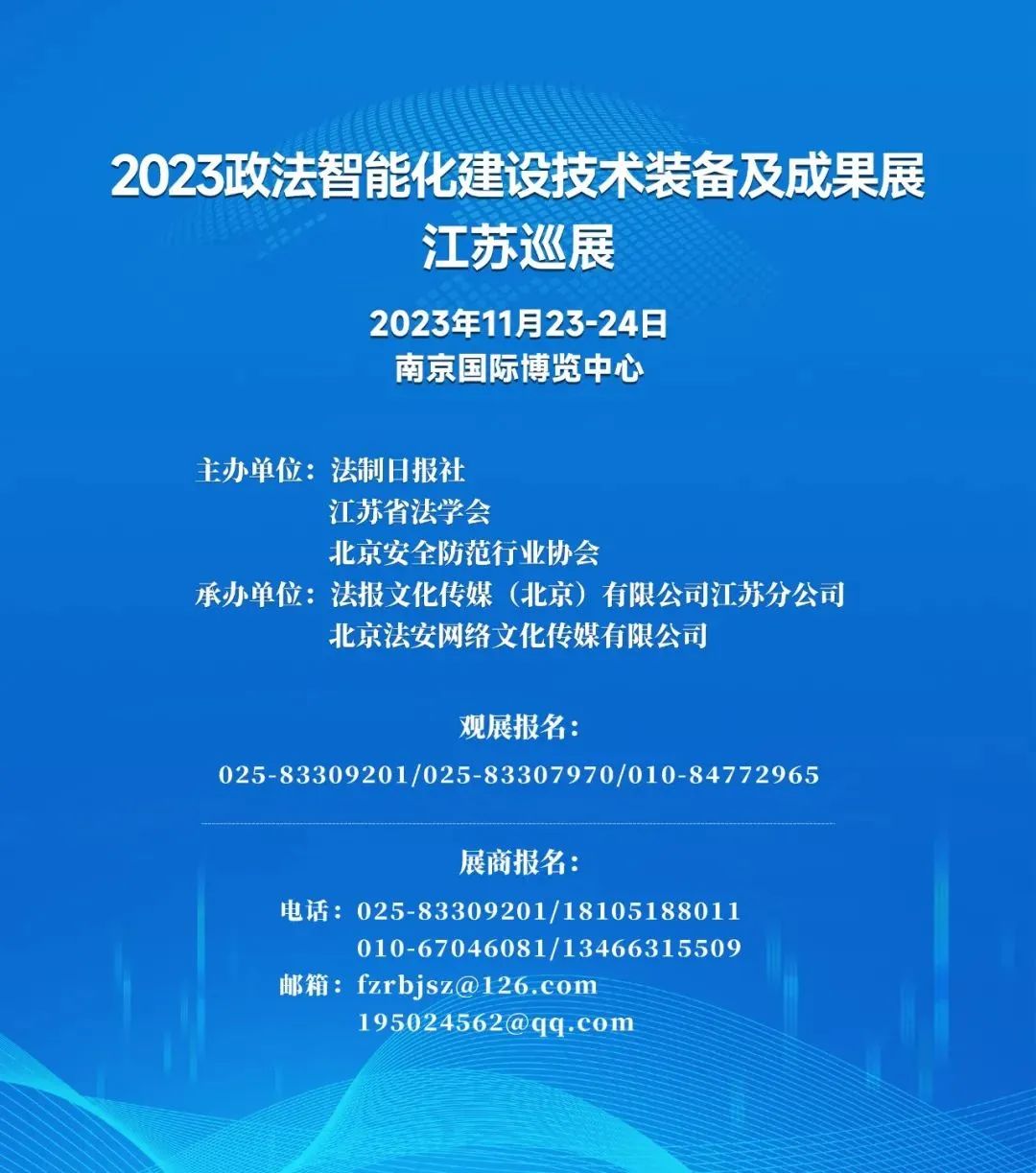 展会将设置“江苏省政法智能化建设成果展区”,集中展示江苏省直政法单位及市县政法单位智能化建设成果,同时设置“江苏智慧法治创新案例展示区”“政法智能化建设创新案例展示区”“科技企业展示区”等专项展览,并围绕江苏政法智能化建设进行经验分享。同期还将举办“2023年江苏智慧法治创新案例发布”“江苏省法学会数字法学研究会年会暨司法大数据应用与研究研讨会”等活动,集中展示江苏省及各地科技创新成果同政法工作深度融合的典型实践案例和国内先进的政法智能化产品方案。