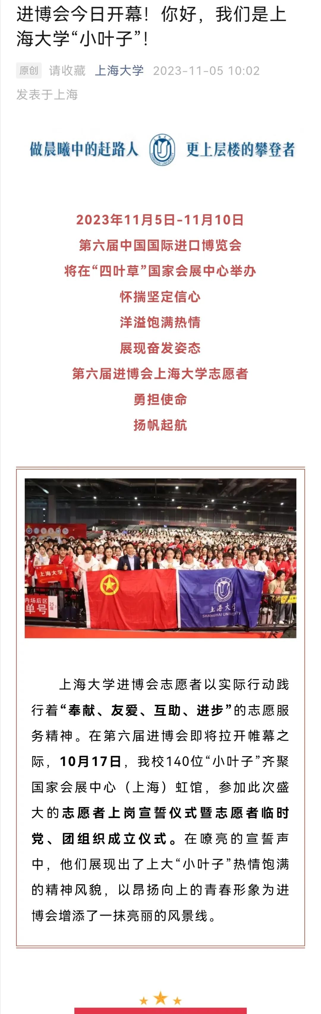 在进博会召开期间,我们发现很多来自上海高校学生的志愿者,据上海大学官微,本次参与志愿者仅上海大学参与学生就达140名,这些志愿者是从400余位候选者中层层选拔,最终招募了140名热爱奉献、勇于担当的“小叶子”,其中共青团员全覆盖,中共党员占一半以上。可谓群英荟萃,百里挑一。