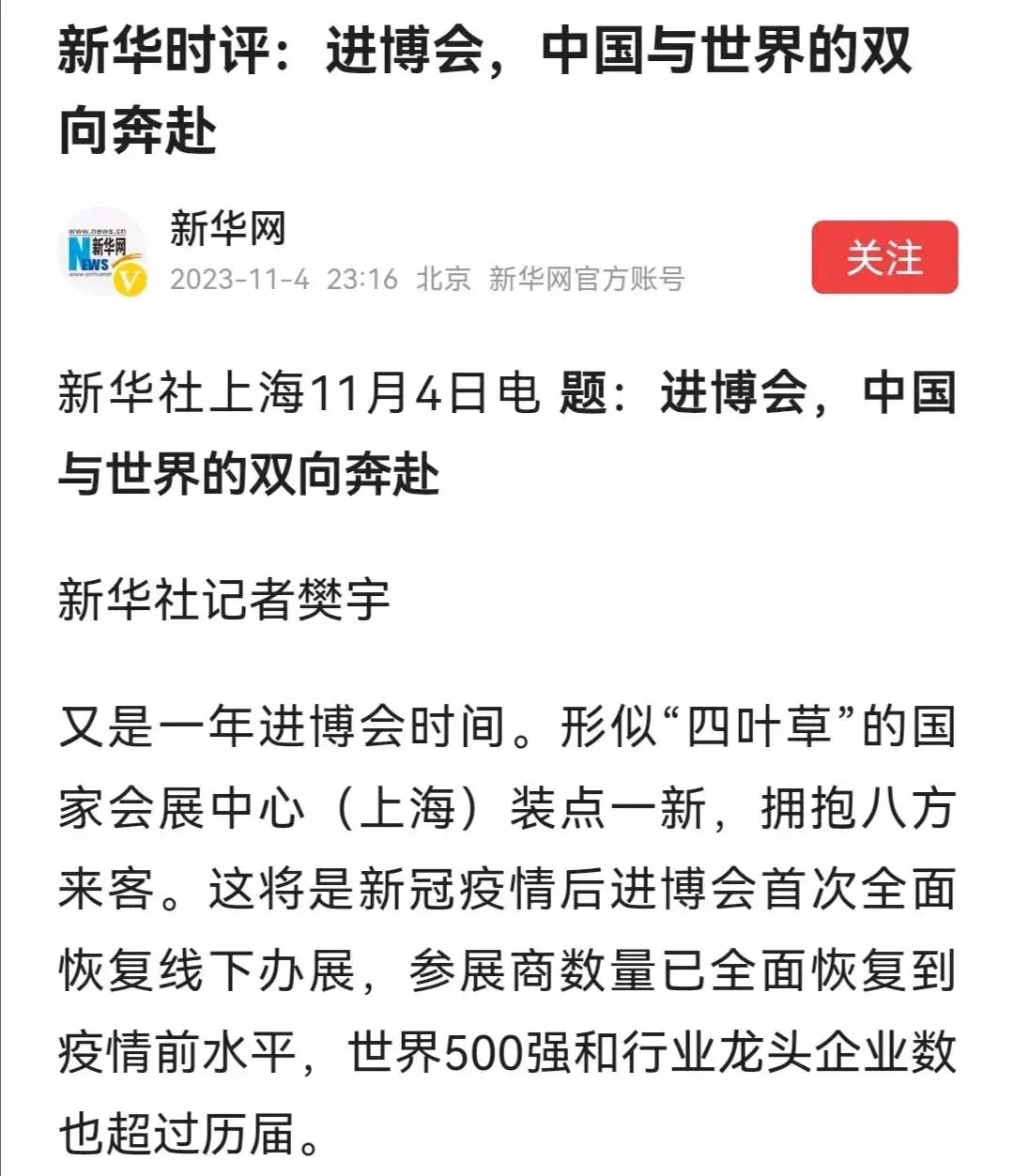 新华社上海11月4日电 题:进博会,中国与世界的双向奔赴