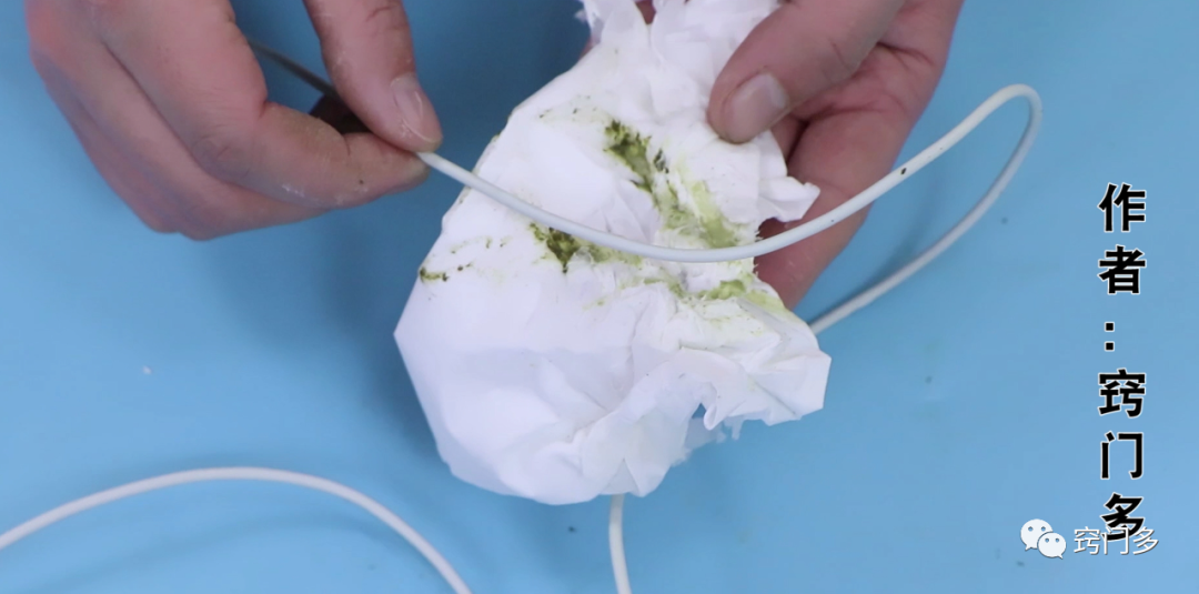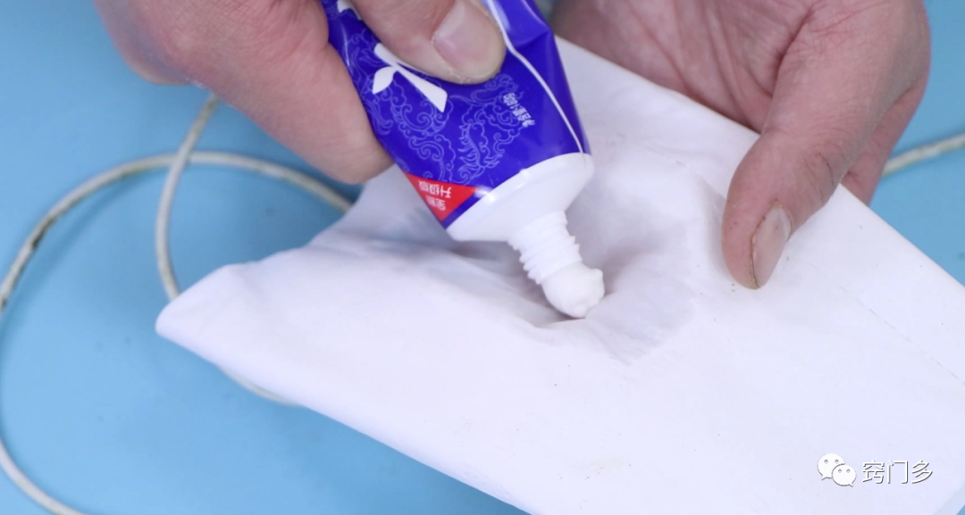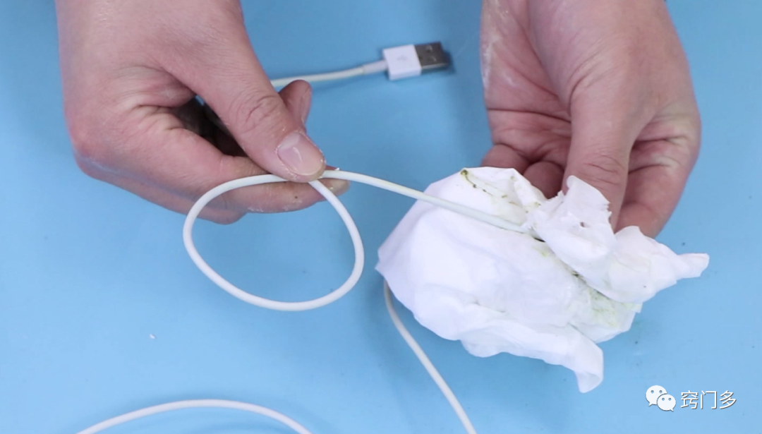 首先我们准备一张纸巾,将我们的白酒滴在我们的纸巾上面,然后再拿出牙膏挤在我们的纸巾上面,就可以用它来清洗我们的数据线,大家看我们擦拭过的这一边