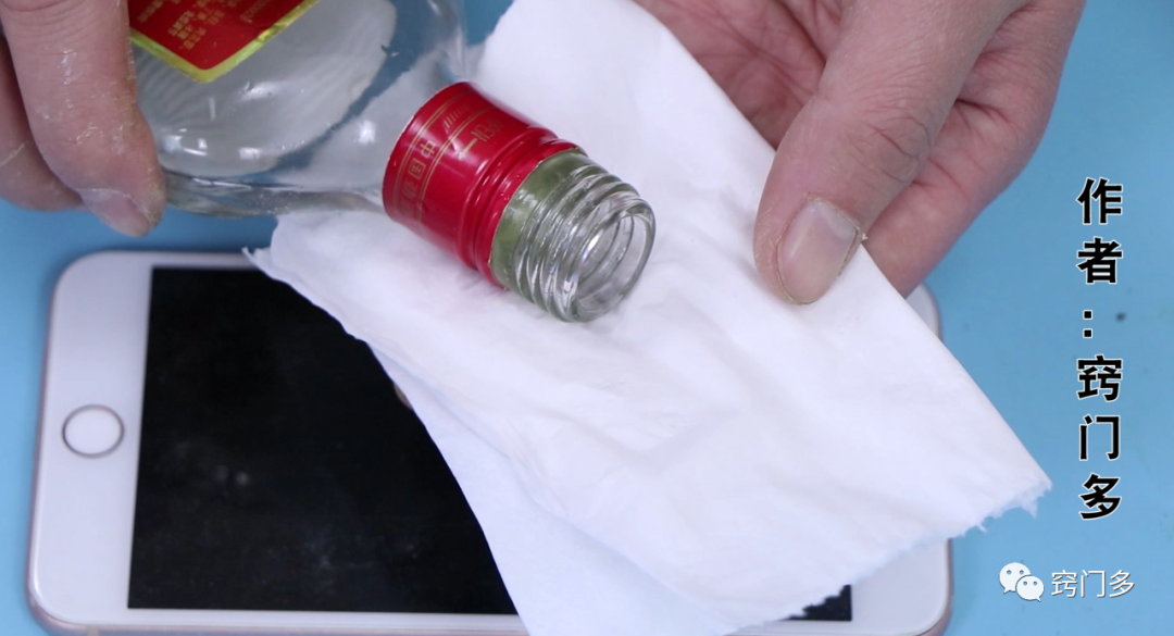 而且还有烦人的手指印,这个时候我们白酒就派上了用场,我们只需要将我们的白酒倒在纸巾上面,然后我们用我们的纸巾,开始擦拭我们的屏幕
