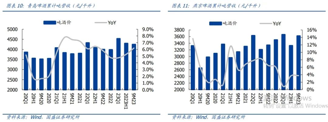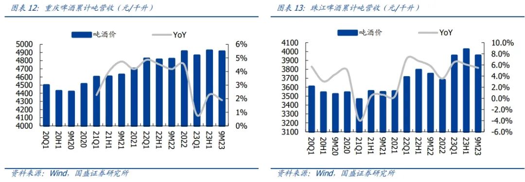 高基数扰动销量增长,啤酒企业量增普遍承压。23Q3单季度青啤/重啤/珠江/燕京/百威亚太中国区销量分别同比-11.3%/+5.3%/+1.4%/+4.2%/-0.2%,其中仅重啤Q3量增快于H1表现,其他啤酒企业均出现量增放缓的情况,青啤在22Q3销量同比+10.6%的基础上销量负增长,23Q3青啤单季度销量仍低于21Q3,我们预计或与公司主动调整产品结构、减少低档产品生产销售有关,百威亚太在中国市场Q3销量亦实现小幅负增长,考虑到百威亚太中国区餐饮及夜场场景消费占比更高,或与餐饮恢复节奏较慢有关。2年CAGR视角下珠江啤酒表现最优,Q3单季度销量稳健增长,重啤亦有不错表现。全年视角下,上市啤酒企业普遍实现较好销量增长,消费场景恢复显著利好啤酒行业。