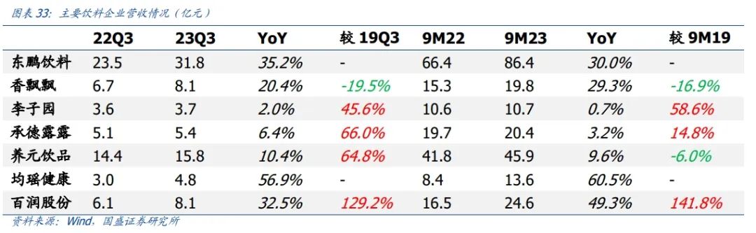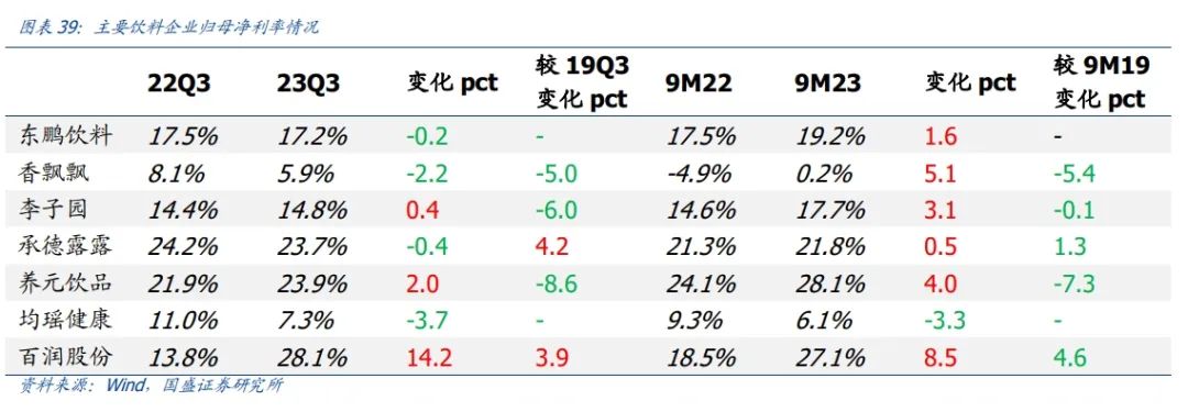 收入端持续恢复,营收普遍加速或高增。23Q3消费场景延续了H1的恢复态势,助力饮料企业在营收端持续恢复,主要饮料企业中仅香飘飘、均瑶和百润Q3单季度营收增速慢于H1,但亦分别实现20.4%/56.9%/32.5%的营收高增长,东鹏饮料Q3较H1营收同比+27.2%的表现进一步加速,李子园、承德露露和养元饮品Q3营收表现亦好于H1,收入端的恢复持续推进。