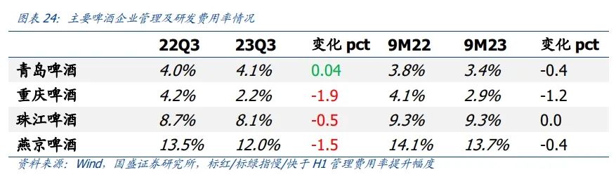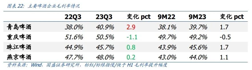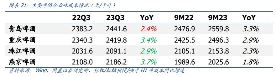 从行业角度,23Q3高基数下量增放缓。2023年7-9月啤酒行业产量分别同比-3.4%/-5.8%/-8.0%,使得23Q3单季度啤酒产量同比-5.7%,较H1产量同比+7.0%的行业表现大幅回落,主要系22Q3高基数(单季度产量同比+7.6%)扰动,我们预计随着2024年消费环境逐渐向好、基数扰动消除,啤酒行业产销量季度间波动将显著降低。