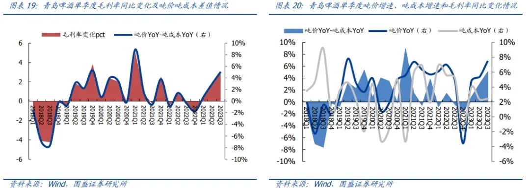 以青岛啤酒为例,关注成本下行期间的毛利率高弹性。复盘青岛啤酒2018Q1以来单季度吨价增速、吨成本增速和毛利率同比变化值的表现可见,当吨价增速与吨成本增速的差值达到最大时,毛利率亦同步展现出了较大弹性,而回顾吨价与吨成本增速差值最大的季度可见,极值均来自于单季度吨成本快速下降的阶段,23Q3青啤单季度吨价与吨成本增速差值再次扩大,考虑到2024年成本或现负增长,有望延续此前毛利率高速增长的态势,高端化大趋势助力吨价增长在报表端持续兑现,吨成本阶段性负增长显著放大毛利率弹性,盈利能力提升正当时。
