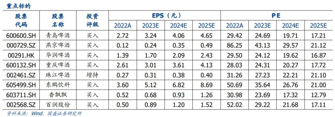 当前估值已回落至低位,布局正当时。截止11月3日收盘啤酒(长江)指数动态估值已回落至5年最低点,同时青啤/燕京/华润/重啤/珠江当前股价对应2024年PE已回落至20/30/20/20/22x,估值具备较高性价比,参考此前我们复盘的历年啤酒最高与最低市值对应Wind一致预期PE情况,主要啤酒企业2024年PE均具备较高配置价值,考虑到2024年高端化趋势延续叠加吨成本有望负增长,明年业绩增速有望较今年进一步加速,戴维斯双击机会可期,核心推荐青岛啤酒、燕京啤酒、华润啤酒,关注重庆啤酒和珠江啤酒的未来变化趋势。