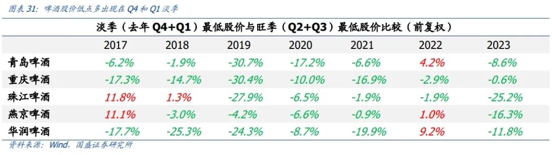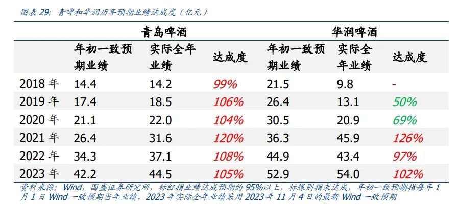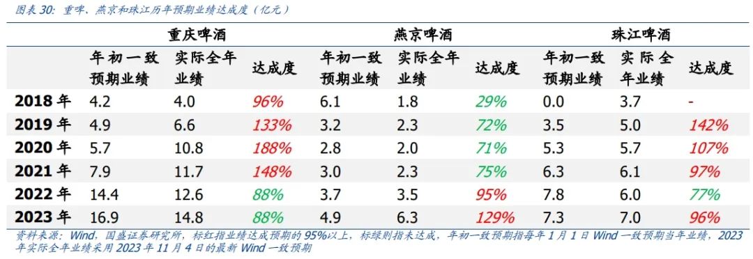 岁末年初,把握啤酒行业盈利预测高确定性带来的投资机遇。我们复盘了青岛啤酒、华润啤酒、重庆啤酒、燕京啤酒和珠江啤酒2018年至今每年年初一致预期与实际业绩达成度的情况,可以看到青岛啤酒和2021年后的华润啤酒全年业绩达成度较高,华润啤酒主要系早年持续推动大规模裁员和关厂,导致报表端归母净利润不能反应实际盈利能力所致,可以看出两大啤酒龙头盈利预测具备极高确定性;重庆啤酒和燕京啤酒2018年以来发展相悖,2019-2021年间重庆啤酒业绩持续超预期,我们预计主要系降本增效叠加乌苏大单品超预期所致,而在2022年乌苏产品增长承压后业绩达成度下降,燕京啤酒在2022年强化改革措施落地后,业绩达成度持续提升,2022和2023年持续释放业绩、2023年业绩有望大超年初预期,珠江啤酒近年表现相对稳定。整体而言,啤酒企业的盈利预测确定性较高,同时全年股价低点多出现在基本面关注度回落的Q4和Q1,我们认为优质啤酒企业在岁末年初的估值切换窗口期具备配置价值。