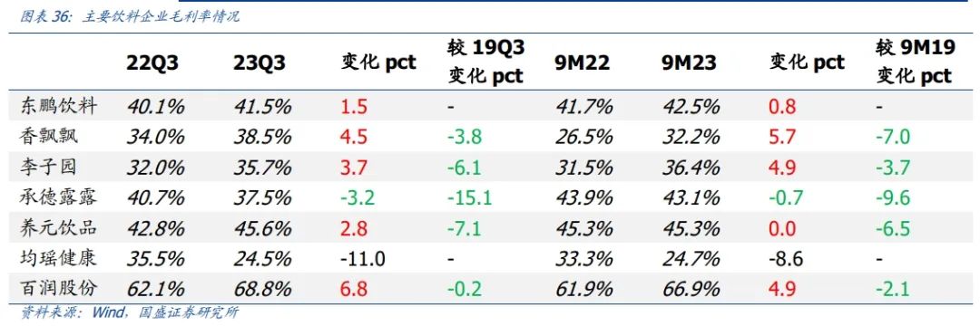 毛利率持续修复,较2019年毛利率高位仍有空间。23Q3主要饮料企业均呈现毛利率修复的趋势,其中均瑶健康毛利率下降幅度较大主要系公司业务结构变化所致,Q3单季度毛利率上行幅度普遍大于H1,带动毛利率持续修复,但相较2019年同期水平仍有差距,我们认为未来随着糖价回落、包材价格稳定,预计毛利率弹性将持续释放。