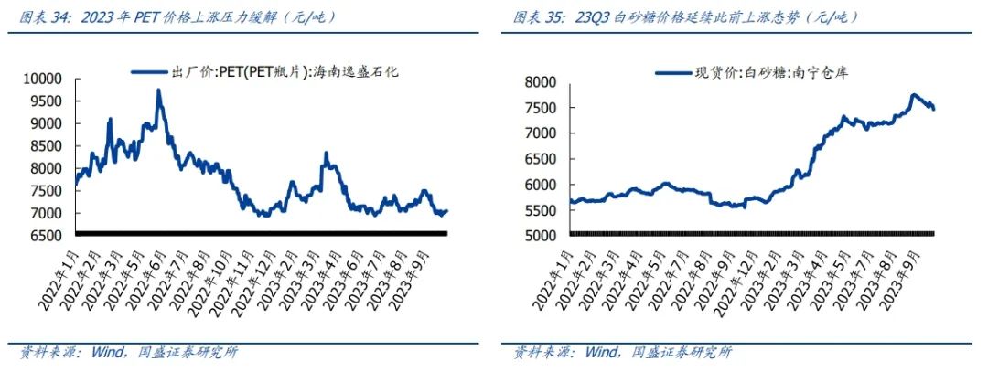 PET价格处于低位,白砂糖价格或见顶回落。PET作为饮料企业的核心包材原材料,22H2以来价格持续下行、结束了自2021年初以来的价格上行趋势,包材价格同比下行带动毛利率压力缓解,预计2024年PET成本压力持续向好;白砂糖价格自2023年初起持续上涨,冲抵了部分包材价格回落带来的毛利率弹性,但9月后糖价高位回落,我们预计2024年糖价有望高位回落。综合来看,预计2024年饮料行业将持续释放毛利率弹性。