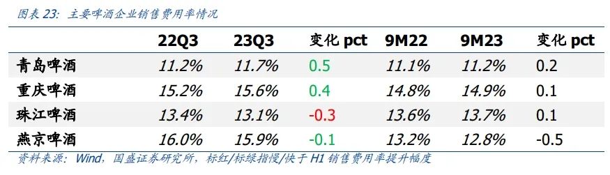 从上市公司角度看,23Q3阶段性仍存成本压力。23Q3除青岛啤酒吨成本同比+2.4%、上升幅度小于H1水平外,重啤、珠江和燕京吨成本上涨幅度均较H1有所加速,我们预计主要系成本项阶段性价格波动所致,拉长来看当前仍处于压力持续下行阶段。从毛利率视角下来看,青啤/重啤/燕京/珠江23Q3毛利率分别同比+2.9/-1.1/+0.2/+0.8pct,仅青岛啤酒毛利率上涨幅度大于H1表现,其他啤酒企业在吨成本扰动下毛利率涨幅收窄,预计毛利率未来会随承办压力缓解持续释放弹性。