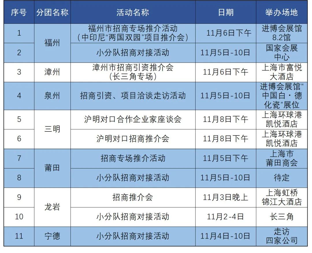 本届进博会期间,福建省将举办和参加国际采购、投资促进、国际合作、人文交流领域共计21场活动,包括“福建省外商投资恳谈会”、“福建新一轮开放政策解读和项目对接会”和“福建省医疗器械及医药保健采购对接会”等3场重点配套活动。福建省各地分团也精心筹备了11场配套活动。通过“你方唱罢我登场”的接力活动全面解读福建扩大开放举措,展示福建发展新机遇,以采购促招商,共同促进福建高质量发展。