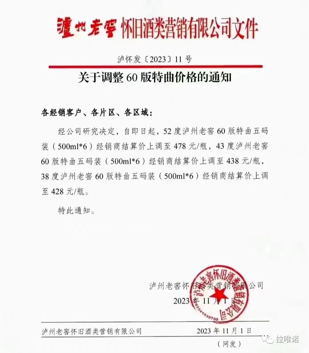 11月1日,一份《泸州老窖怀旧酒类营销有限公司文件》的通知在网上流传。根据该文件显示,经公司研究决定,自即日起,52度泸州老窖60版特曲五码装(500ml*6)经销商结算价上调至478元/瓶,43度泸州老窖60版特曲五码装(500ml*6)经销商结算价上调至438元/瓶,38度泸州老窖60版特曲五码装(500ml*6)经销商结算价上调至428元/瓶。