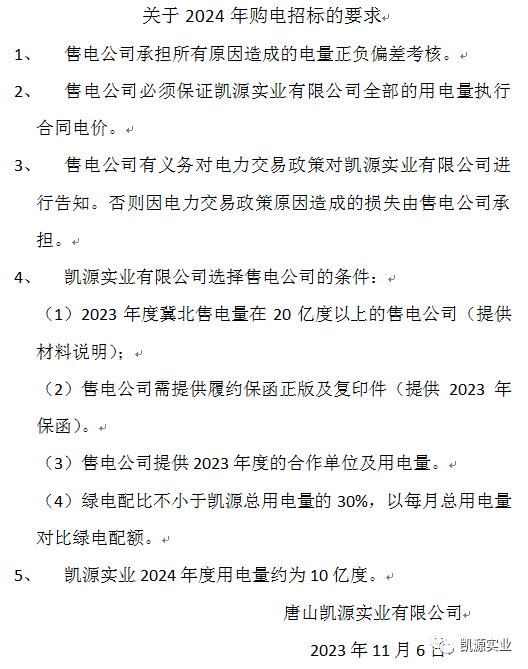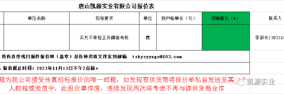点击上方蓝色文字一键关注我们!公司拟对2024年度购电实行招标采购,请于2023年11月13日14:00之前将投标文件发至tskysyyxgs@163.com(加盖公章有效),报价要求:要注明所能供应质保期、供货期、付款方式及联系方式,提供公司资质。我公司根据各供应商报价由低到高综合选择。该邮箱为我公司接受传真招标报价的唯一邮箱,如发现有供货商将报价单私自发送至其他个人邮箱或微信中,此报价单作废,连续发现两次将考虑不再与该供货商合作。