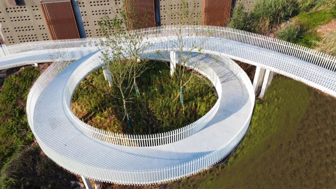 独具特色的旋转廊道也为步道增添了更多趣味性与体验,穿梭在光影林语间,公园美景、公共艺术作品尽收眼底,在方便市民出行的同时,展示了悦来国际会展城生态+艺术相容共生的独特城市风貌。