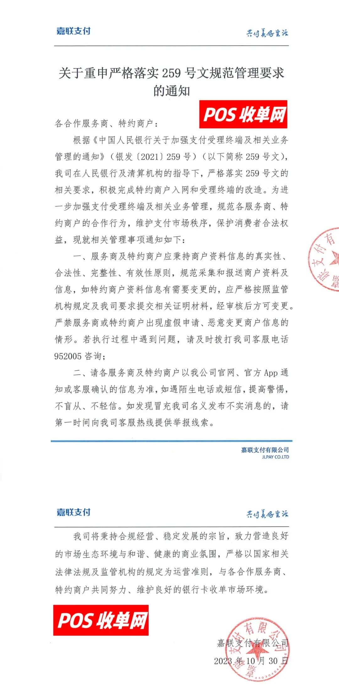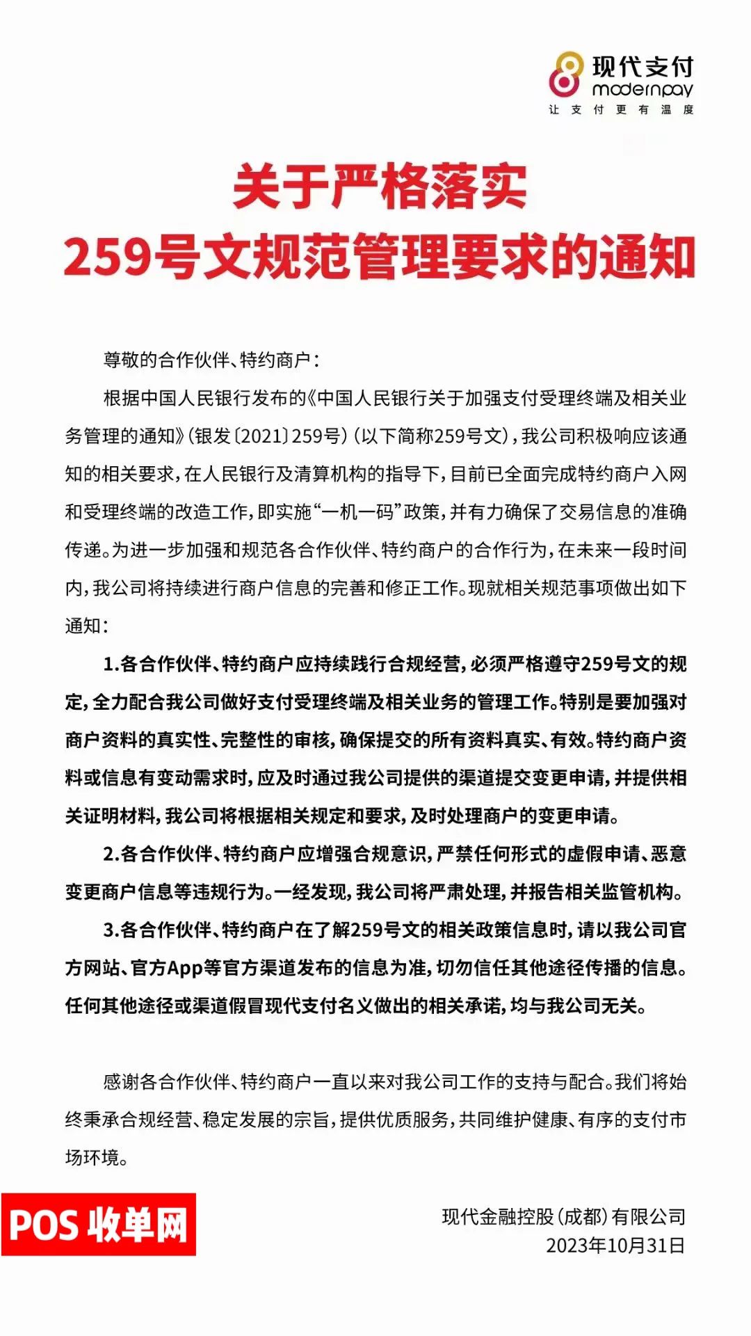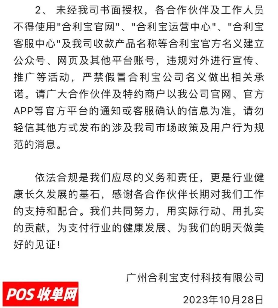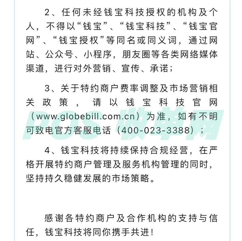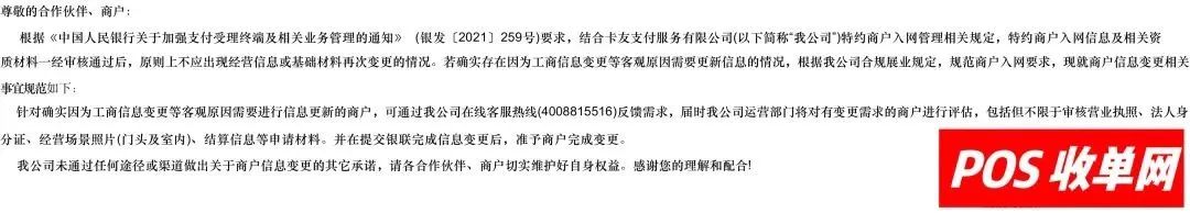 2.各合作伙伴、特约商户应增强合规意识,严禁任何形式的虚假申请、恶意变更商户信息等违规行为。一经发现,我公司将严肃处理,并报告相关监管机构。如有侵权,请联系删除
