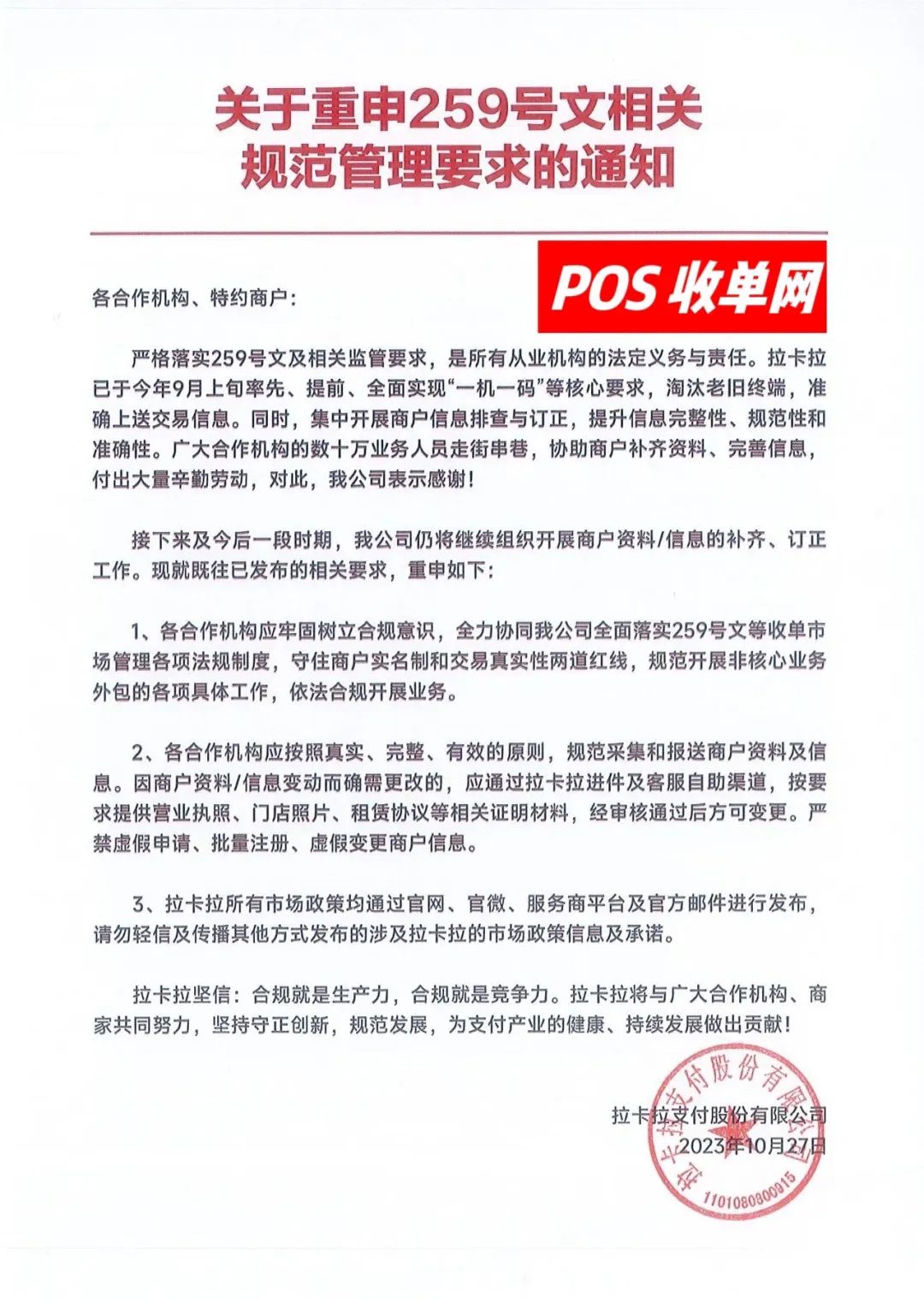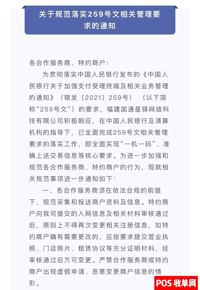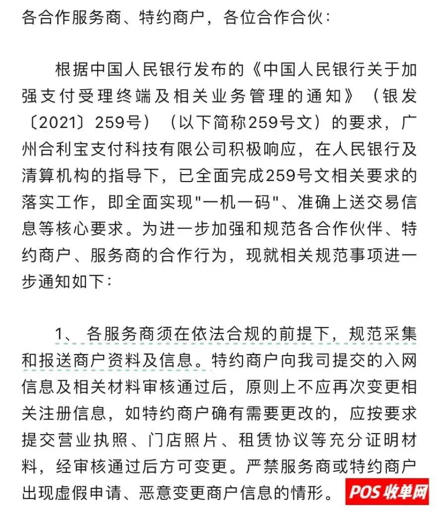 近日,拉卡拉、合利宝、卡友支付、嘉联支付、乐刷、国通、联动优势、金控、钱宝分别发布了关于严格执行259文件的公告,同时,将限制没有营业执照的商户注册后再重新更换商户名称,一机一码严格执行已经是板上钉钉的事情了。接下来及今后一段时期,我公司仍将继续组织开展商户资料/信息的补齐、订正工作。现就既往已发布的相关要求,重申如下: