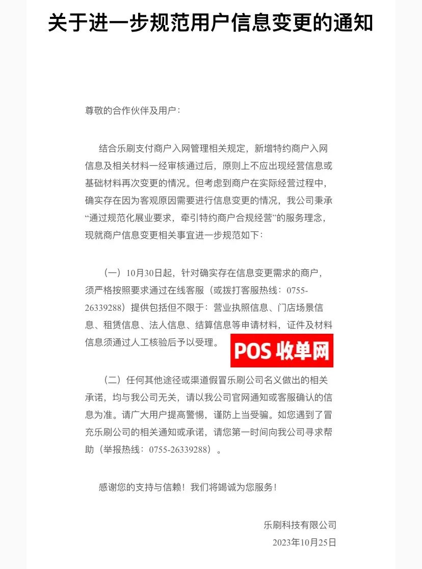一、服务商及特约商户应秉持商户资料信息的真实性、合法性、完整性、有效性原则,规范采集和报送商户资料及信息,如特约商户资料信息有需要变更的,应严格按照监管机构规定及我司要求提交相关证明材料,经审核后方可变更。严禁服务商或特约商户出现虚假申请、恶意变更商户信息的情形。若执行过程中遇到问题,请及时拨打我司客服电话952005 咨询;结合乐刷支付商户入网管理相关规定,新增特约商户入网信息及相关材料一经审核通过后,原则上不应出现经营信息或基础材料再次变更的情况。但考虑到商户在实际经营过程中,确实存在因为客观原因需要进行信息变更的情况,我公司秉承“通过规范化展业要求,牵引特约商户合规经营”的服务理念,现就商户信息变更相关事宜进一步规范如下: