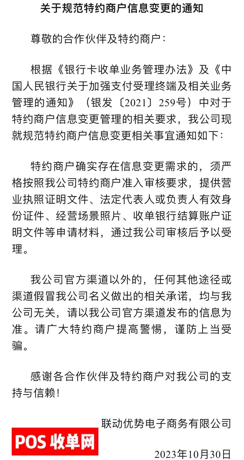 1、各服务商须在依法合规的前提下,规范采集和报送商户资料及信息。特约商户向我司提交的入网信息及相关材料审核通过后,原则上不应再次变更相关注册信息,如特约商户确有需要更改的,应按要求提交营业执照、门店照片、租赁协议等充分证明材料,经审核通过后方可变更。严禁服务商或特约商户出现虚假申请、恶意变更商户信息的情形。因为工商信息变更等客观原因需要更新信息的情况,根据我公司合规展业规定,规范商户入网要求,现就商户信息变更相关事宜规范如下:针对确实因为工商信息变更等客观原因需要进行信息更新的商户,可通过我公司在线客服热线(4008815516)反馈需求,届时我公司运营部门将对有变更需求的商户进行评估,包括但不限于审核营业执照、法人身分证、经营场景照片(门头及室内)、结算信息等申请材料。并在提交银联完成信息变更后,准予商户完成变更。为进一步加强支付受理终端及相关业务管理,规范各服务商、特约商户的合作行为,维护支付市场秩序,保护消费者合法权益,现就相关管理事项通知如下: