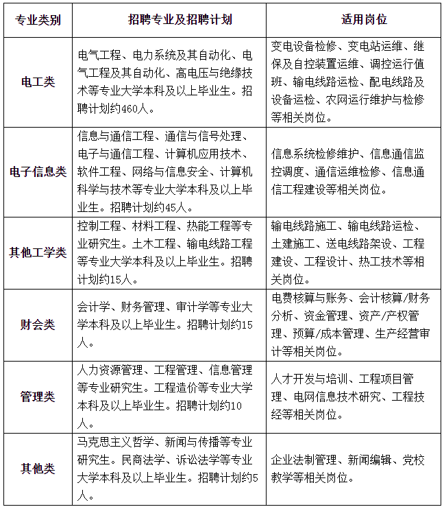 招聘专业类别为电工类、电子信息类、其他工学类、财会类、管理类及其他专业,招聘专业是指主修专业,不包含辅修专业。因上级单位尚未核定下达2024年招聘计划,最终招聘数量将根据上级单位核定情况相应调整。第一批招聘计划(含提前批招聘计划)暂定如下: