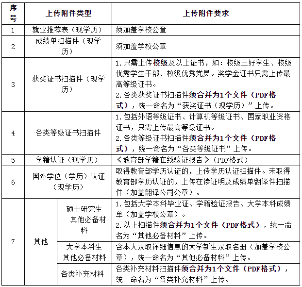 3.上传应聘附件材料。应聘毕业生须通过招聘平台及时、规范上传个人应聘附件材料,应聘附件材料文档数量不超过7个。应聘毕业生应确保应聘材料能正常打开、清晰显示,因应聘材料不能正常打开、图像不清晰或未按规范要求填报导致的结果由应聘毕业生本人承担。上传附件具体要求如下: