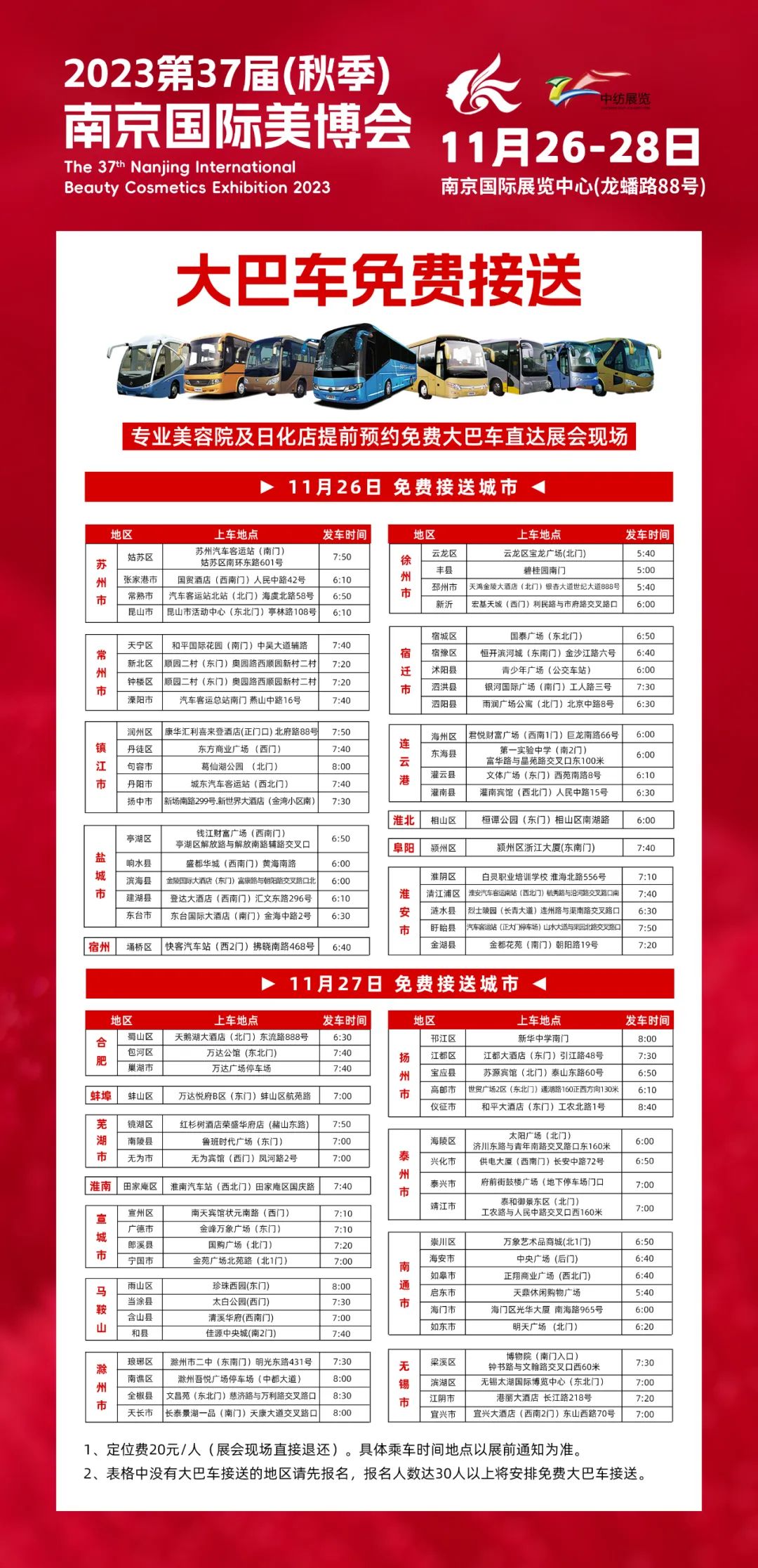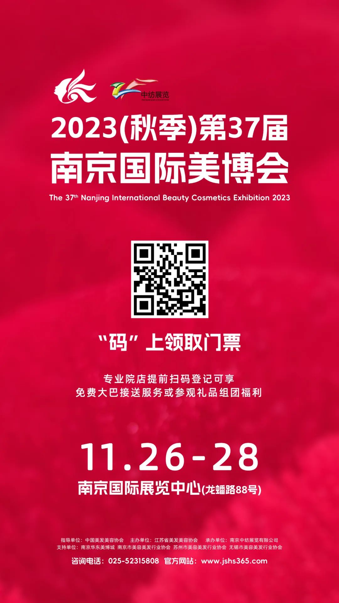 本次南京国际美博会为了给预约参观的观众提供更好的观展体验,特别准备了免费大巴车接送福利。在周边地市设立免费大巴车乘坐点(部分地区提供免费住宿)。如需了解或预约可以扫描下方二维码进行预约。