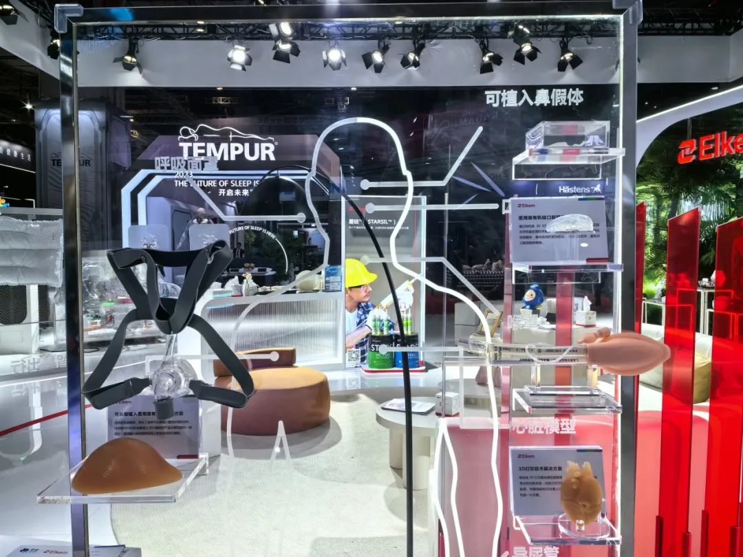 埃肯有机硅在本次进博展台上展出的应用于工业软体的机器人、术前仿真模型、心脏模型等生命健康领域的3D打印产品,是吸引观众驻足的一大亮点。