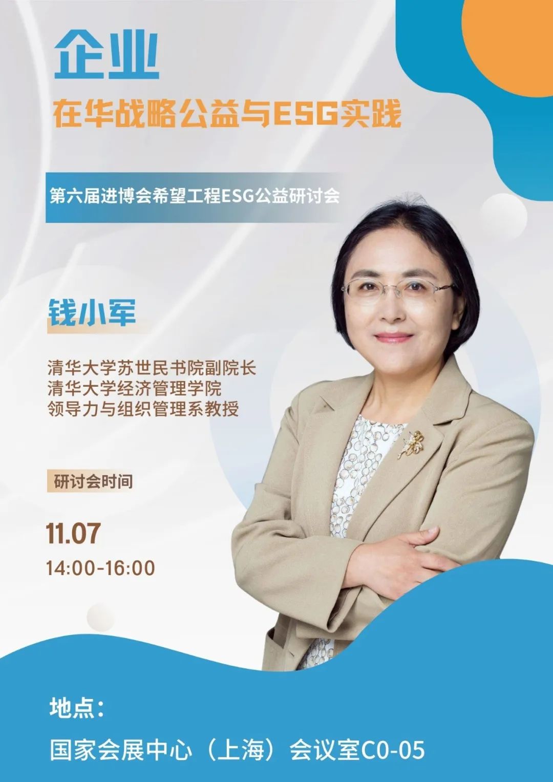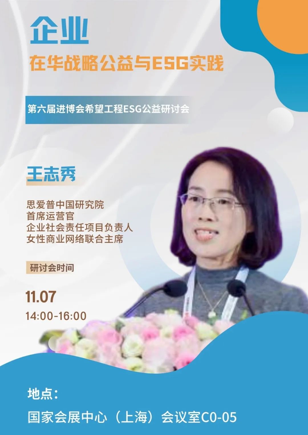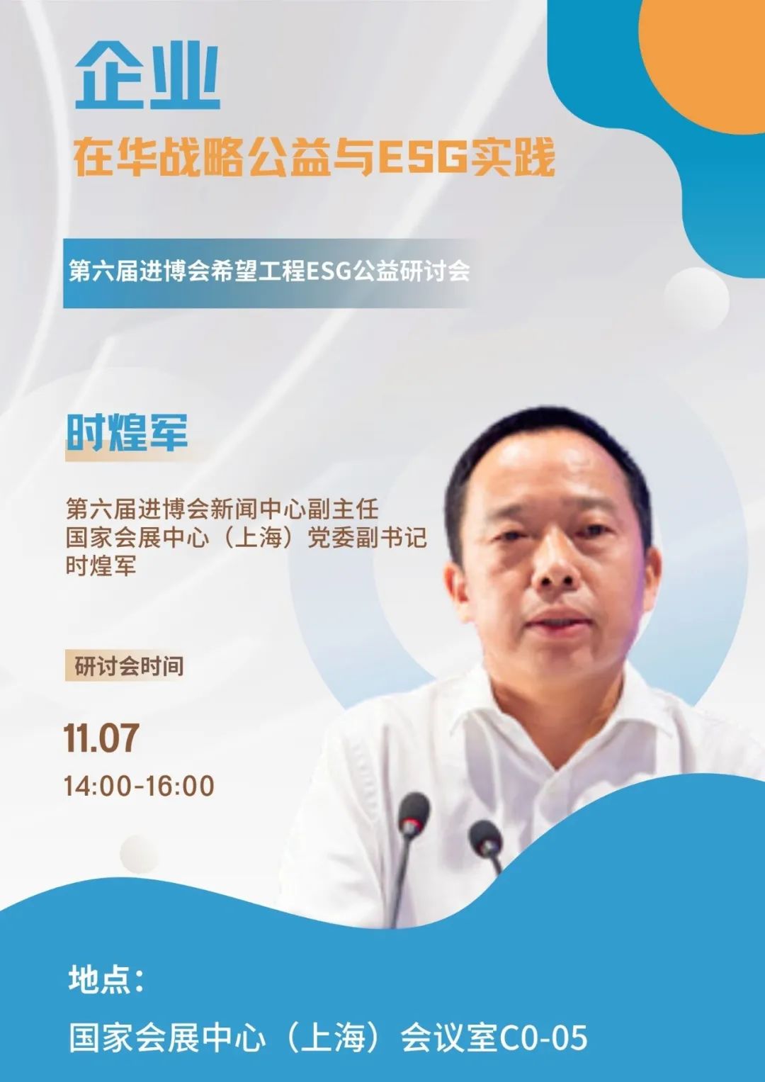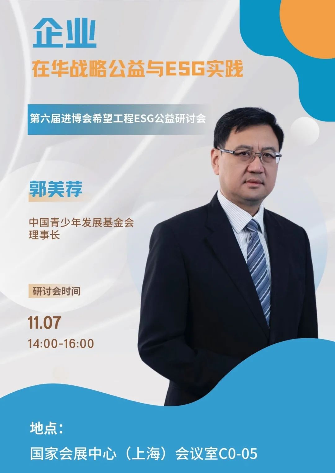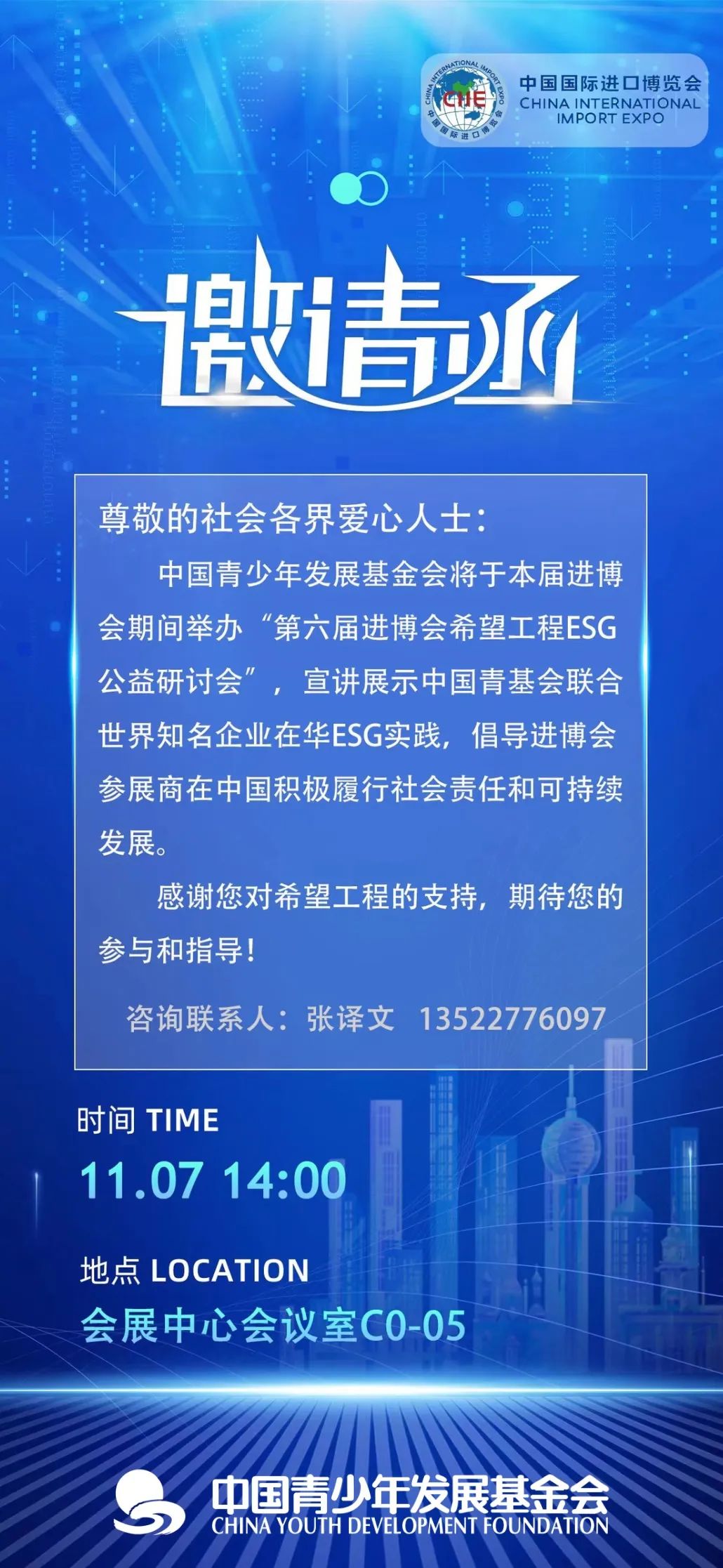 11月7日(明天),中国青基会将举办“第六届进博会希望工程ESG公益研讨会”(会展中心会议室C0-05),通过主旨演讲、战略公益与ESG管理的价值连接、圆桌讨论展示中国青基会联合世界知名企业在华ESG实践,倡导进博会参展商在中国积极履行社会责任和可持续发展。