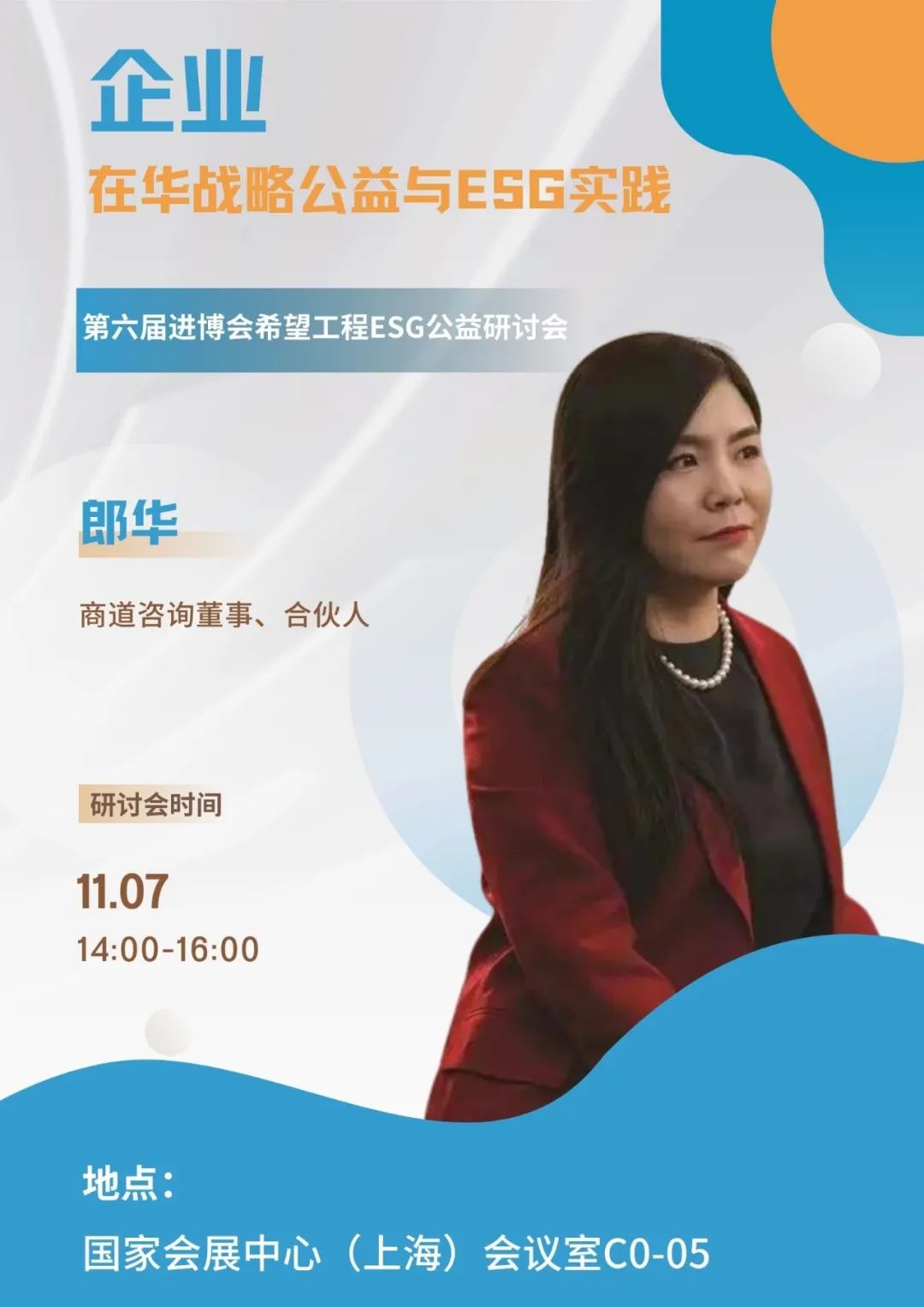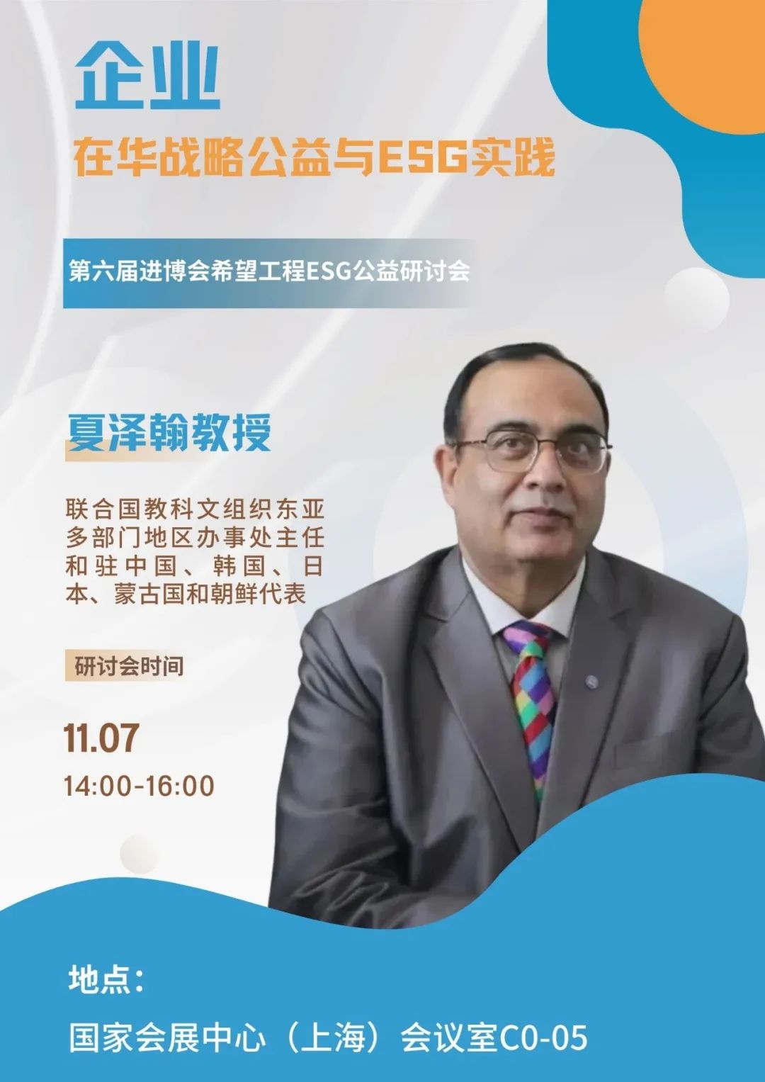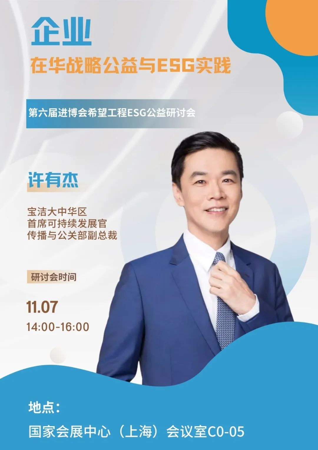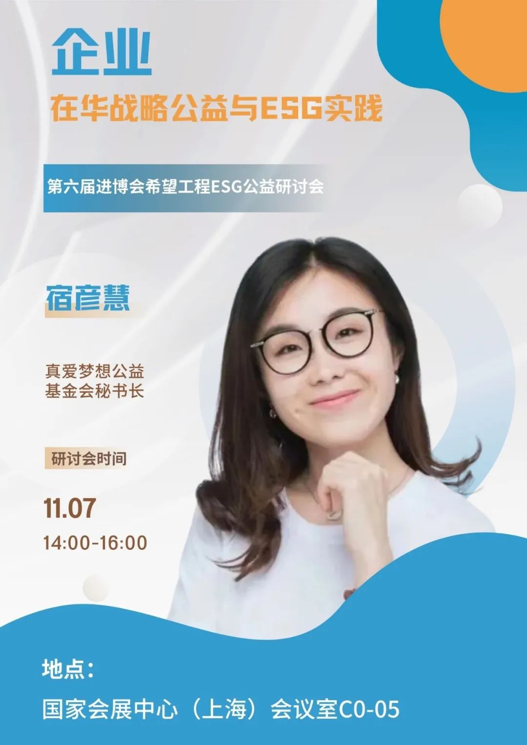 11月7日(明天),中国青基会将举办“第六届进博会希望工程ESG公益研讨会”(会展中心会议室C0-05),通过主旨演讲、战略公益与ESG管理的价值连接、圆桌讨论展示中国青基会联合世界知名企业在华ESG实践,倡导进博会参展商在中国积极履行社会责任和可持续发展。