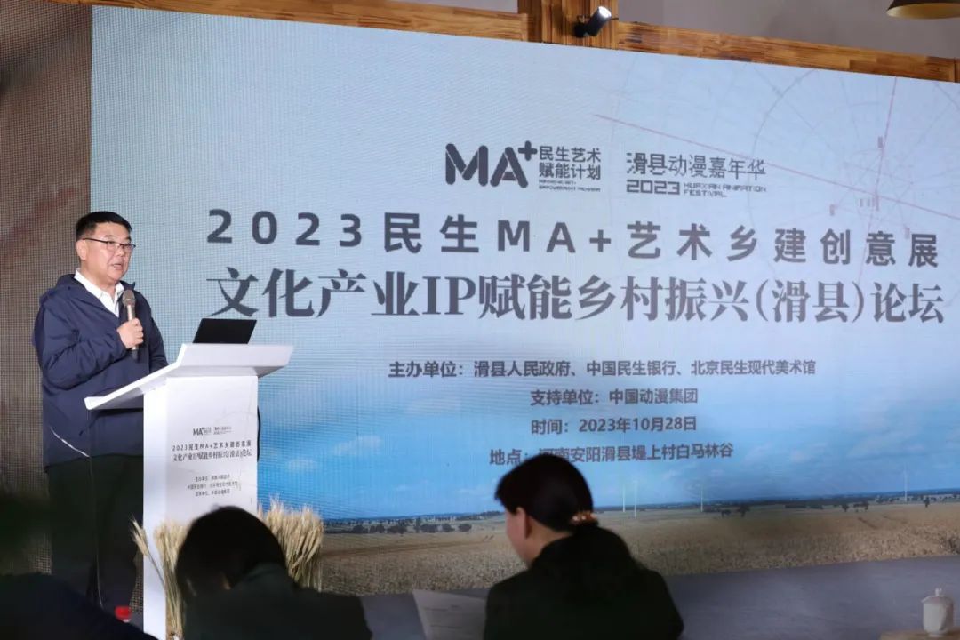 为推动乡村艺术文化与旅游的深度融合、培育文化新业态和乡村艺术人才、构筑艺术赋能乡村文化振兴的长效机制、形成共建共治共享的新格局,2023年10月28日下午,“2023民生MA+艺术乡建创意展暨文化产业IP赋能乡村振兴(滑县)论坛”在安阳滑县百美村庄·堤上村白马林谷举行。作为滑县首届动漫嘉年华期间的重要活动之一,活动由滑县人民政府、中国民生银行、北京民生现代美术馆主办,并得到了中国动漫集团大力支持。