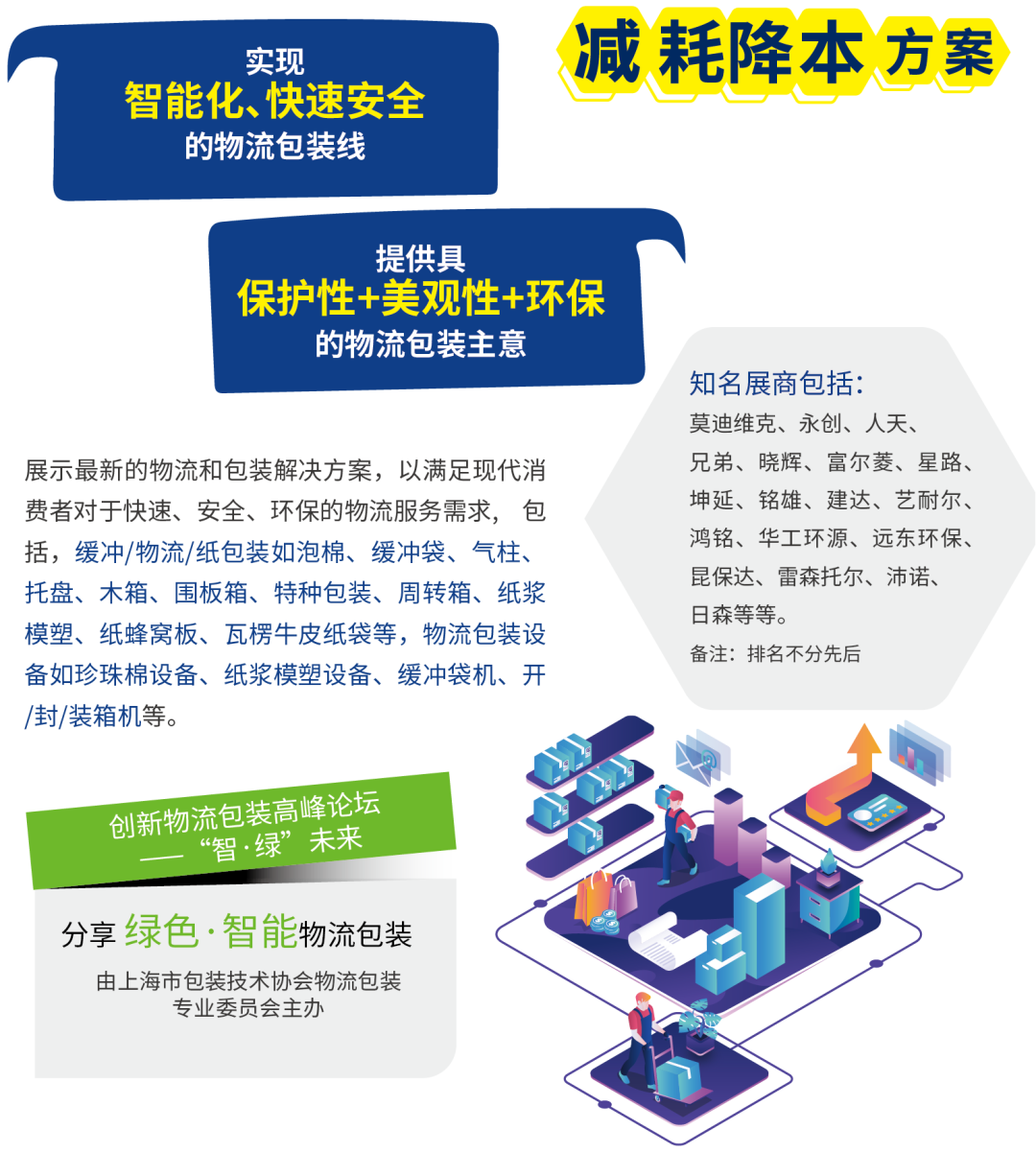 物流板块部分,展示最新物流包装解决方案,满足对快速、安全、环保的物流服务需求,包括缓冲/物流/纸包装如泡棉、缓冲袋、气柱、托盘、木箱、围板箱、特种包装、周转箱、纸蜂窝板、瓦楞牛皮纸袋等,物流包装设备如开/封/装箱机等,智能化物流包装线等。