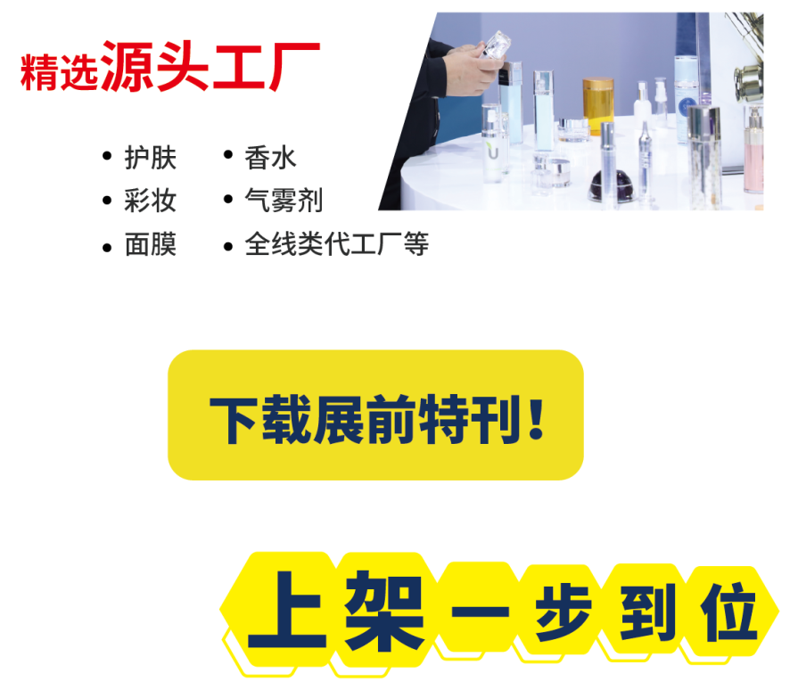 专区将集结众多精选供应商,提供高品质的彩妆、护肤、面膜、气雾剂、香水以及全线类代工产品,部份包括雅妍、妆泽、万盈、优护优家、中研、晴姿、艾妍、馥琳、御梵、棉芙、心悦、亚拓、康美、科思美、碧优蒂等,提供高品质的彩妆、护肤、面膜、气雾剂、香水以及全线类代工产品。无论您的品牌定位如何,您只需提出需求和想法,一站式解决方案都将由这些包装源头企业为您提供。