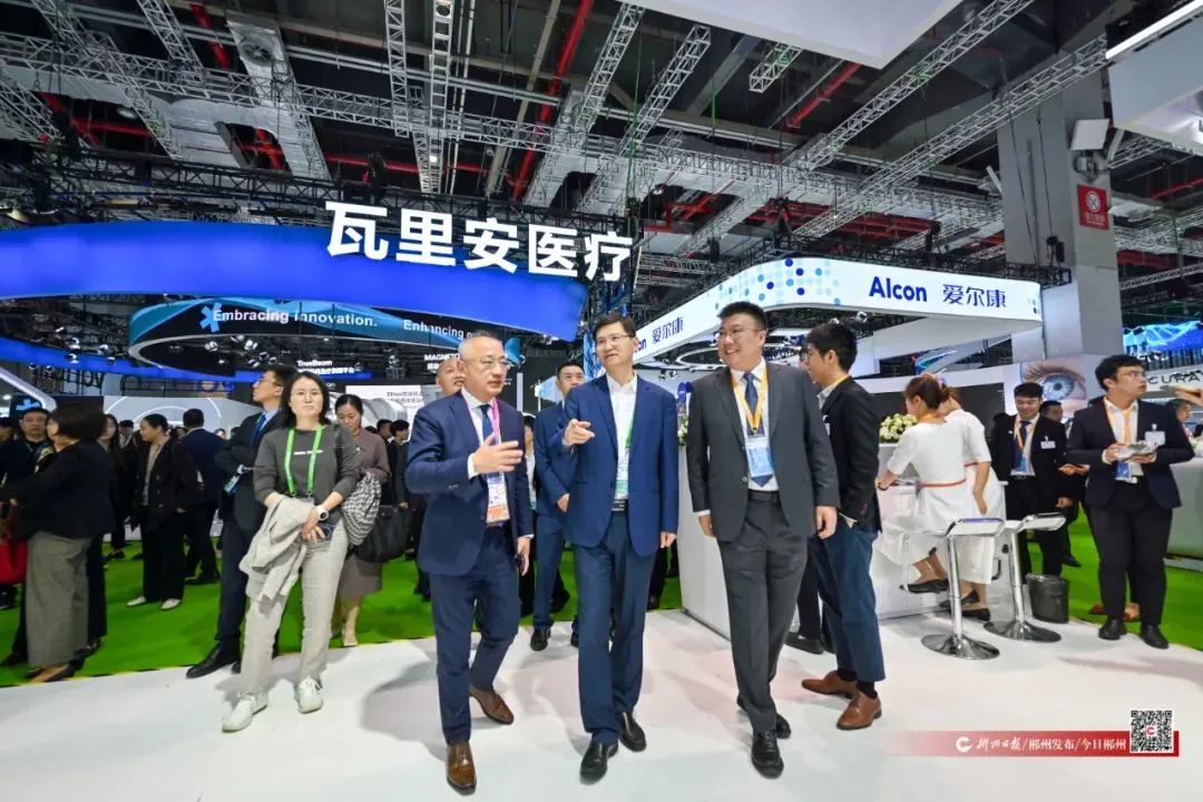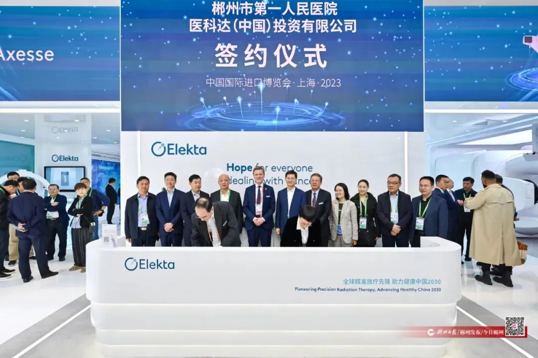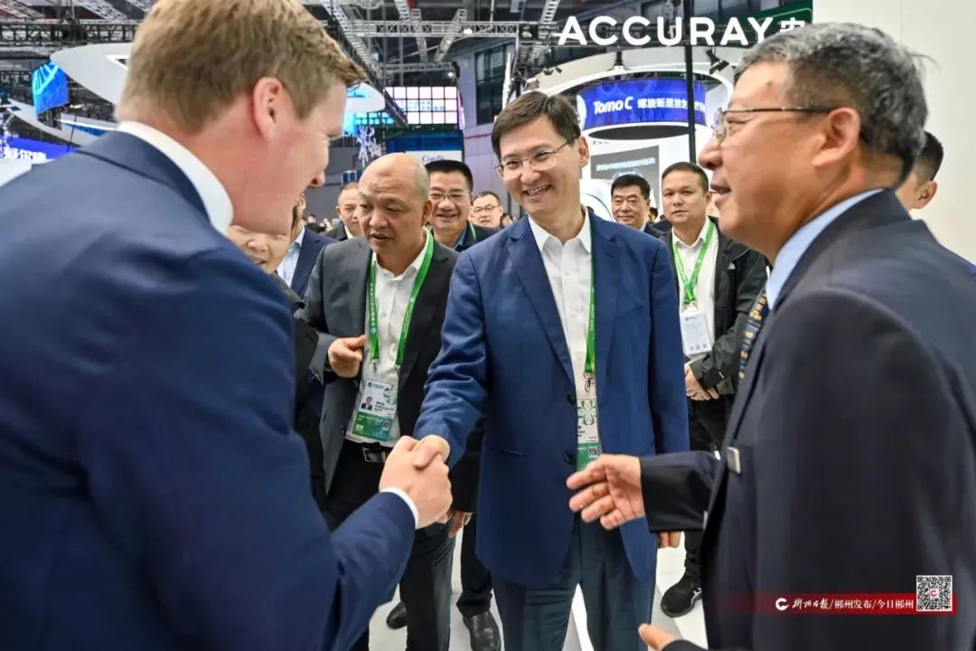 阚保勇参观了医科达、丹纳赫、西门子、GE医疗等企业展区,与相关负责人深入交流,详细了解企业的主要产品、业务布局、技术研发、在郴投资等情况,邀请他们来郴州考察、合作,并见证了郴州市第一人民医院与医科达(中国)投资有限公司签署合作协议。