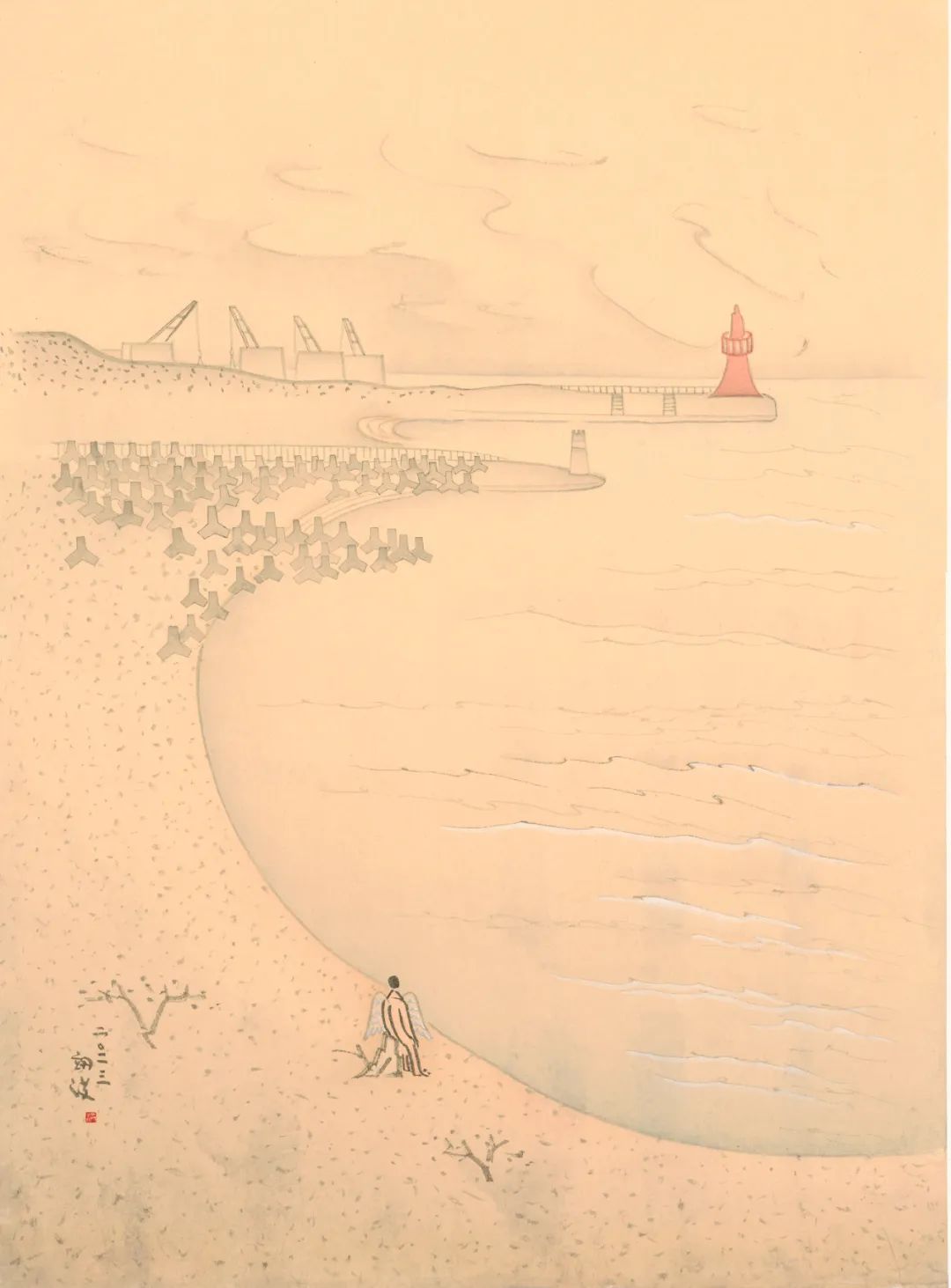 简翊洪(b.1988)从传统水墨出发,发展出属于自己时代的人物造型。图中的少年往往是自己的隐喻,在真实生活中用心体会生活百态,有时悠游于一处一角,有时面对辽阔的天地。竟也与古人的生活情趣对话。