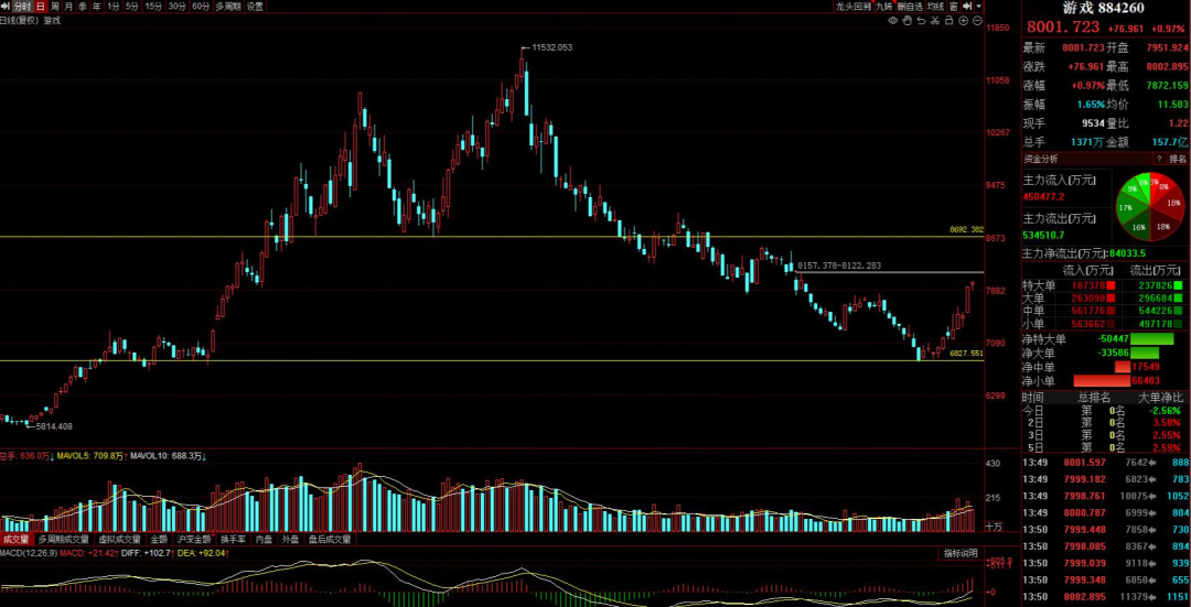 昨天就很多朋友问我游戏走不走,其实我的观点很明确了,只要尾盘没有出现一半以上的回踩,那么就继续持有,昨日游戏是收的大阳线,很明显是没有回踩的,今日的游戏指数趋势良好,目前是一个小小的阳锤子线,并没有改变反弹的趋势,继续持有就好。