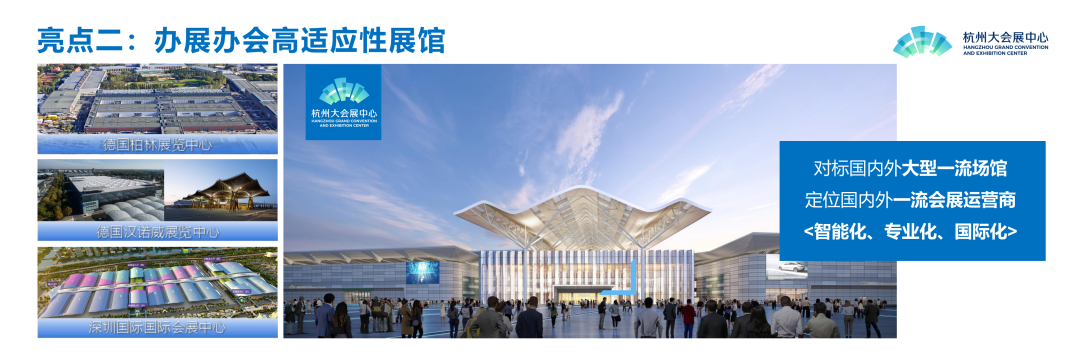杭州大会展中心选址位于临空经济示范区先行启动区域之一的会展商务板块,按照新一代会展综合体标准设计,设置标准展厅、会议中心、活动中心等多种复合功能,可满足展览、会议、节庆、赛事、演艺等会展活动应用场景,投入运营后将成为浙江最强综合性会展场馆。