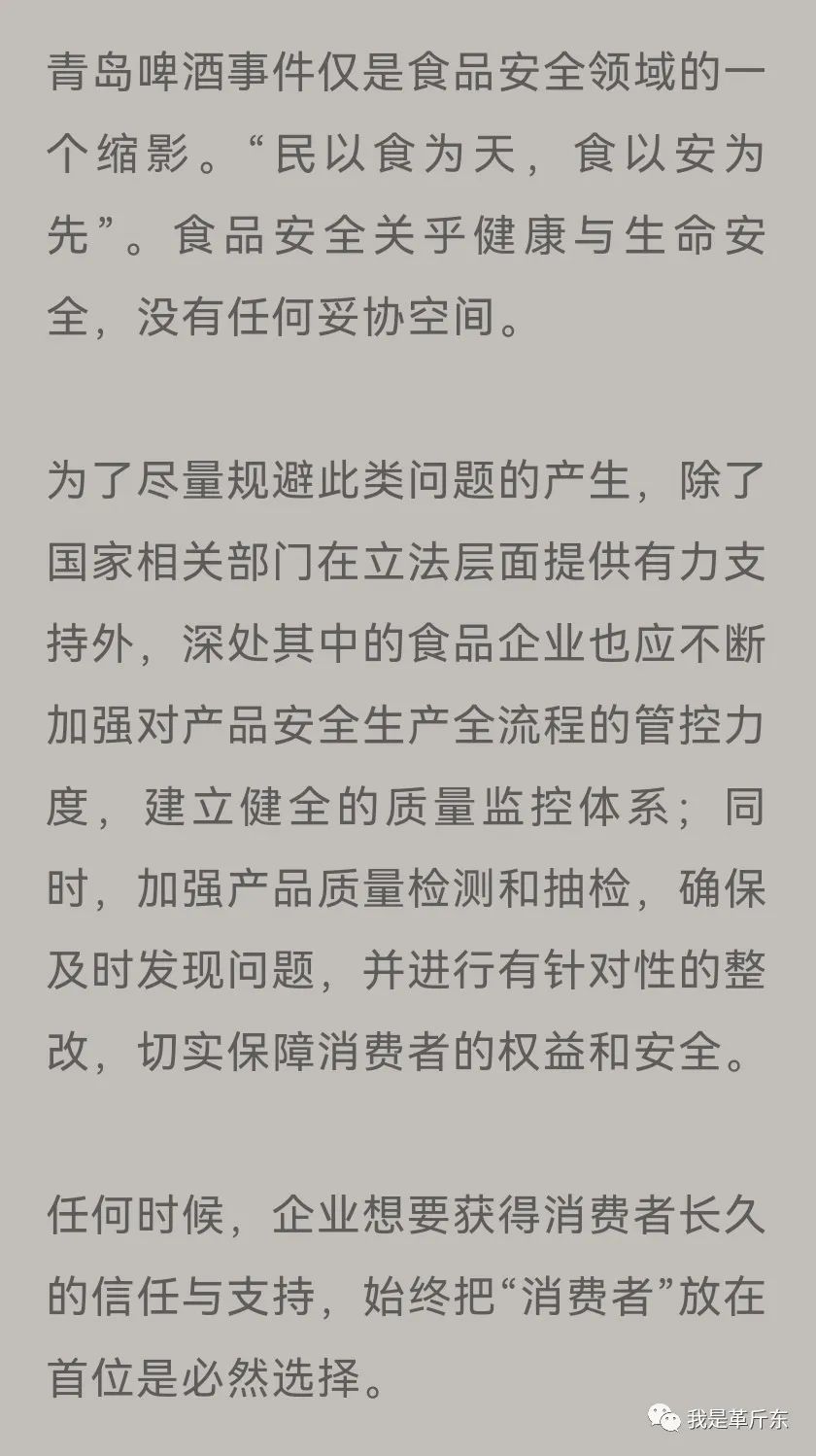 经平度市联合调查组调查,2023年10月19日13时许,外包业务公司青岛智和商贸有限公司装卸工人崔某某在青岛啤酒三厂内一运送原料的货车车厢内小便,公安机关以涉嫌故意损毁财物依法对其行政拘留。此事的发生,反映出我们在原料运输管理上有漏洞,对此我们深感内疚和痛心,一定认真反思和整改。在此,向广大消费者表示真诚的歉意!此事发生后,公司积极配合平度市联合调查组的调查,迅速开展排查整顿,全面加强内部管理。主要采取了以下整改措施:1.严格落实质量管控体系,原料运输车辆全部改为全封闭自卸车,实现人员与物料全程无接触;厂区监控系统升级为人工智能行为识别监控系统,加强全过程实时有效监控。2.强化外包业务人员管理,纳入工厂一体化管理,进一步加强培训并严格考核。3.公司成立专项调查组,正在对相关责任单位、责任人的失职行为进行调查,并依规依纪严肃处理。4.对已封存的麦芽,公司正在市场监管部门的监督下对其进行无害化处理,确保不进入食品生产加工环节。我们将深刻汲取教训,举一反三,认真整改,进一步加大全流程质量管控,确保产品质量,维护青岛啤酒的百年品牌声誉,以实际行动和高质量产品回报广大消费者对我们的信任和支持。