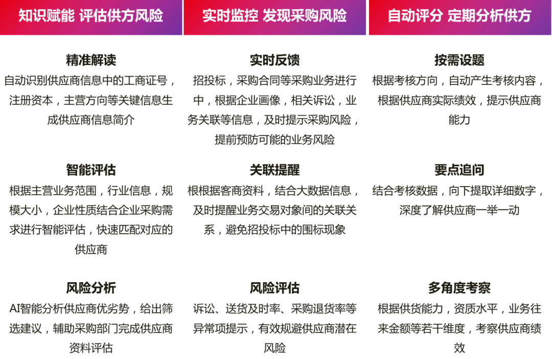 企业供应商管理,需要在规避风险的基础上,更快速的理解供应商市场,更好的分析出现有供应商的绩效能力,仅靠人力是无法同时达成上述目标。基于YonGPT的智能供应链通过利用用友供应商池的数据,构建供应商管理的数据大模型,依靠智能判别能力,帮助采购方更快找到合适供应商,更好定位采购状况,更精准规避采购风险。