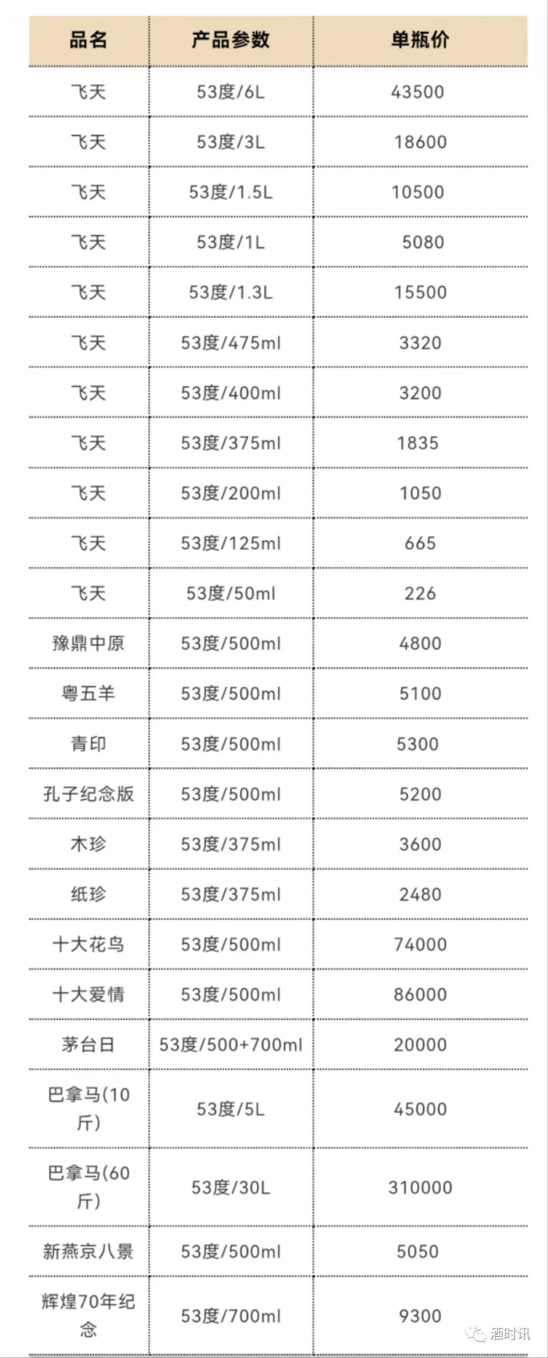 0 珍5 53%VOL 500ML 135 135 0 珍酒尊藏 53%VOL 500ML 255 255 0 老珍酒 53%VOL 500ML 80 80 0 古井贡系列 规格 11.6 11.7 涨幅 古20 52%VOL 500ML 500 500 0 古16 52%VOL 500ML 320 320 0 古8 50%VOL 500ML 220 220 0 古5 50%VOL 500ML 103 103 0 幸福版 50%VOL 500ML 76 76 0 安酒系列 规格 11.6 11.7 涨幅 经典 53%VOL 500ML 650 650 0 臻藏 46+70%VOL 500ML 410 410 0 恒昌烧坊 规格 11.6 11.7 涨幅 1经典 53%VOL 500ML 390 390 0 西凤系列 规格 11.6 11.7 涨幅 红西凤 55%VOL 500ML 725 725 0 酒海陈藏(10年) 52%VOL 500ML 150 150 0 酒海陈藏(5年) 42%VOL 500ML 78 78 0 华山论剑10 52%VOL 500ML 130 130 0 华山论剑20 52%VOL 500ML 255 255 0 华山论剑30 55%VOL 500ML 380 380 0 华山论剑50 52%VOL 500ML 480 480 0 老绿玻瓶 55%VOL 500ML 40 40 0 怀庄 规格 11.6 11.7 涨幅 怀庄聖品 53%VOL 500ML 150 150 0 怀庄大曲 53%VOL 500ML 160 160 0 丹泉系列 规格 11.6 11.7 涨幅 丹泉10 50%VOL 500ML 150 150 0 丹泉15 53%VOL 500ML 400 400 0 丹泉20 53%VOL 500ML 510 510 0 丹泉30 53%VOL 500ML 835 835 0 双沟系列 规格 11.6 11.7 涨幅 圣坊 46%VOL 500ML 150 150 0 君坊 52%VOL 500ML 85 85 0 双沟大曲 53%VOL 500ML 12 12 0 口子窖系列 规格 11.6 11.7 涨幅 30年型 52%VOL 500ML 720 720 0 20年型 41%VOL 500ML 320 320 0 10年型 41%VOL 500ML 215 215 0 6年型 41%VOL 500ML 100 100 0 潭酒系列 规格 11.6 11.7 涨幅 紫潭 53%VOL 500ML 390 390 0 红得发紫 53%VOL 500ML 275 275 0 红潭 53%VOL 500ML 190 190 0 金酱 53%VOL 500ML 125 125 0 银酱 53%VOL 500ML 90 90 0 杜康系列 规格 11.6 11.7 涨幅 小封坛(青坛) 46%VOL 500ML 310 310 0 小封坛(玉坛) 52%VOL 500ML 620 620 0 12窖区(新) 52%VOL 500ML 175 175 0 9窖区(新) 50%VOL 500ML 105 105 0 6窖区(新) 50%VOL 500ML 70 70 0 白云边系列 规格 11.6 11.7 涨幅 20年陈酿 53%VOL 500ML 410 410 0 15年陈酿 42%VOL 500ML 140 140 0 12年陈酿 42%VOL 500ML 100 100 0 5星 53%VOL 500ML 80 80 0 4星 53%VOL 500ML 50 50 0 3星 53%VOL 500ML 36 36 0 个性茅台系列参考价格